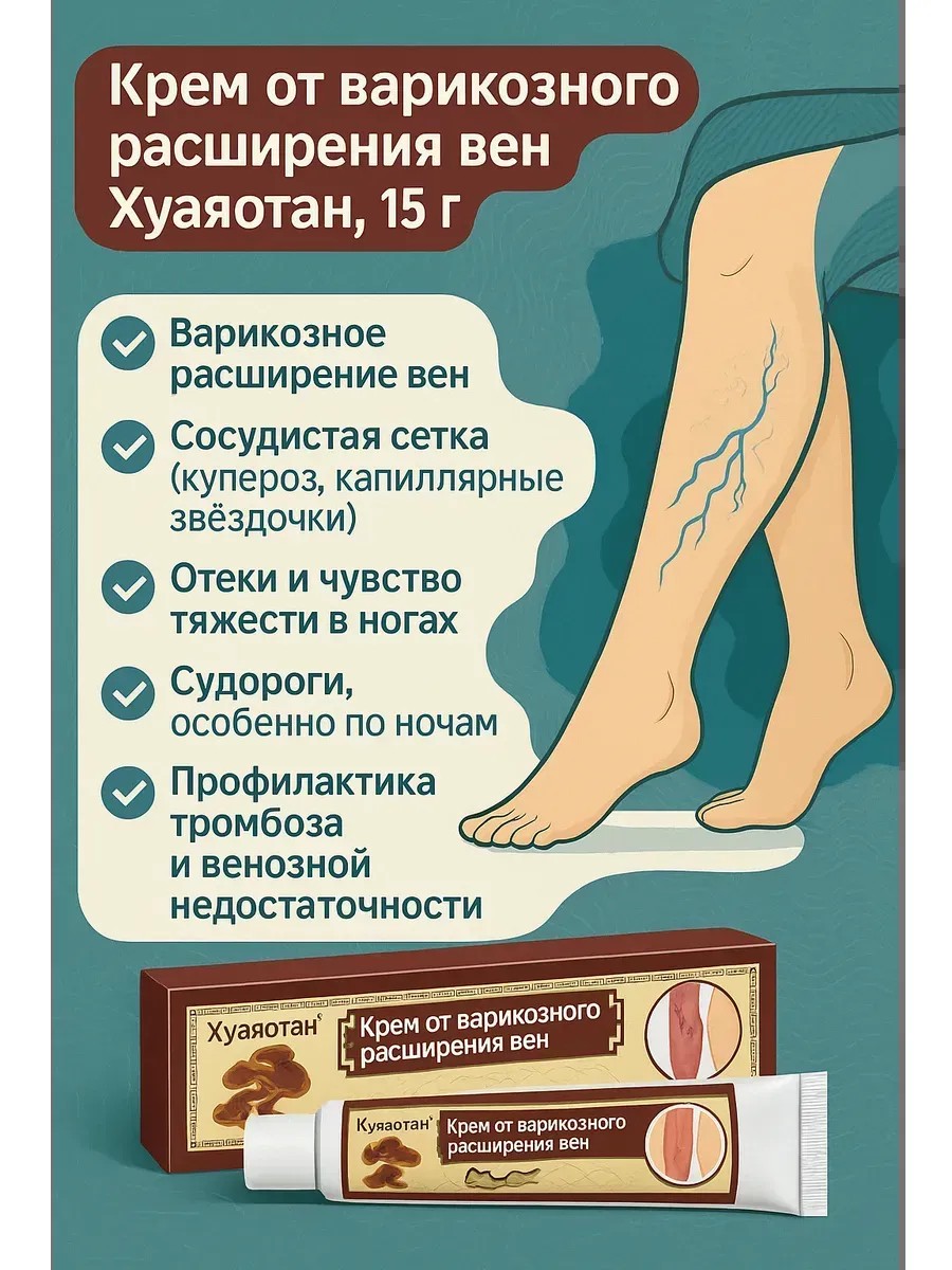 Крем от варикозного расширения вен Хуаяотан, 15 г — эффективное средство для снятия отёков, боли и тяжести в ногах