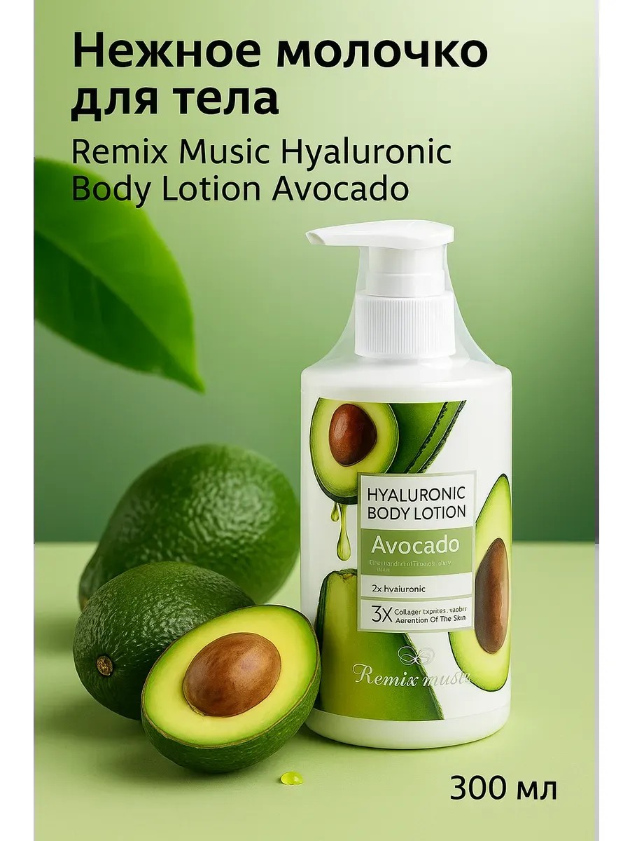 Нежное молочко для тела Remix Music Hyaluronic Body Lotion Avocado, 300 мл — это больше, чем просто питательный крем. Это ваш ежедневный ритуал ухода с насыщенным увлажнением и бархатистой мягкостью кожи. Формула с 2× гиалуроновой кислотой и 3× коллагеном проникает в глубокие слои кожи, устраняя сухость, шелушение и ощущение стянутости. Натуральный экстракт авокадо питает, восстанавливает и придаёт коже упругость. жирный крем для тела увлажняющий для сухой кожи впитывается мгновенно, не оставляя липкости. Аромат сочных фруктов поднимает настроение и сопровождает в течение дня. Парфюмированный Лосьон для тела женский без спирта, без минеральных масел, безопасен для аллергиков. Сделано в Китае. Протестировано дерматологами. Стильный флакон с дозатором — удобно брать с собой. Для женщин, которые любят заботиться о себе каждый день.