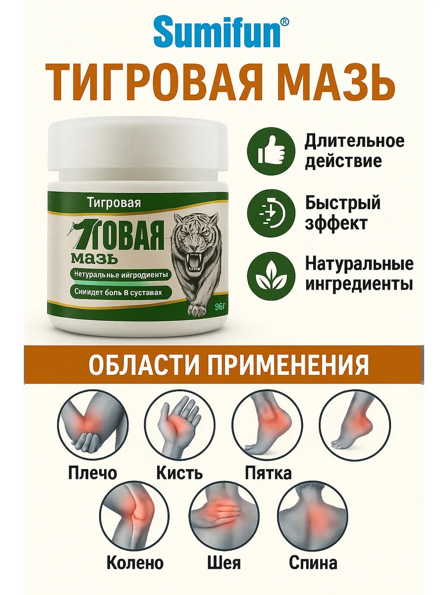 Tiger Ointment — лечебная чудо мазь китайская , созданная на основе традиционной рецептуры, предназначена для снятия скованности, воспаления и боли в суставах и мышцах.