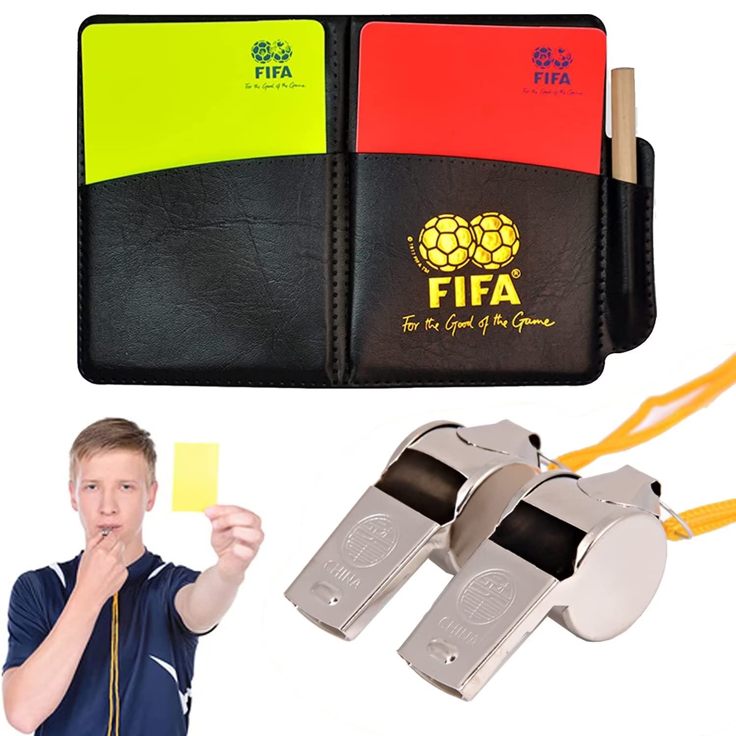 ? Inserted in many ways: The referee set is suitable for school or child sports training, football games, but also for referees, coaches and children.? Product use: Referee set It can help you to control the game order and make the game smoothly.If necessary, show the perpetrator the red and yellow card to stop the violation.? Competible card holder: The referee cards set contains red and yellow referee cards that can be bent back and do not break slightly. The referee card can be removed quickly and easily.? referee whistle set: the sound is crisp and can quickly attract attention. She has a lanyard that can be hung around the neck and used at any time.? referee card set: Referee set contains 2 whistles, a yellow and a red referee card;It is indispensable for many sports and referees.
