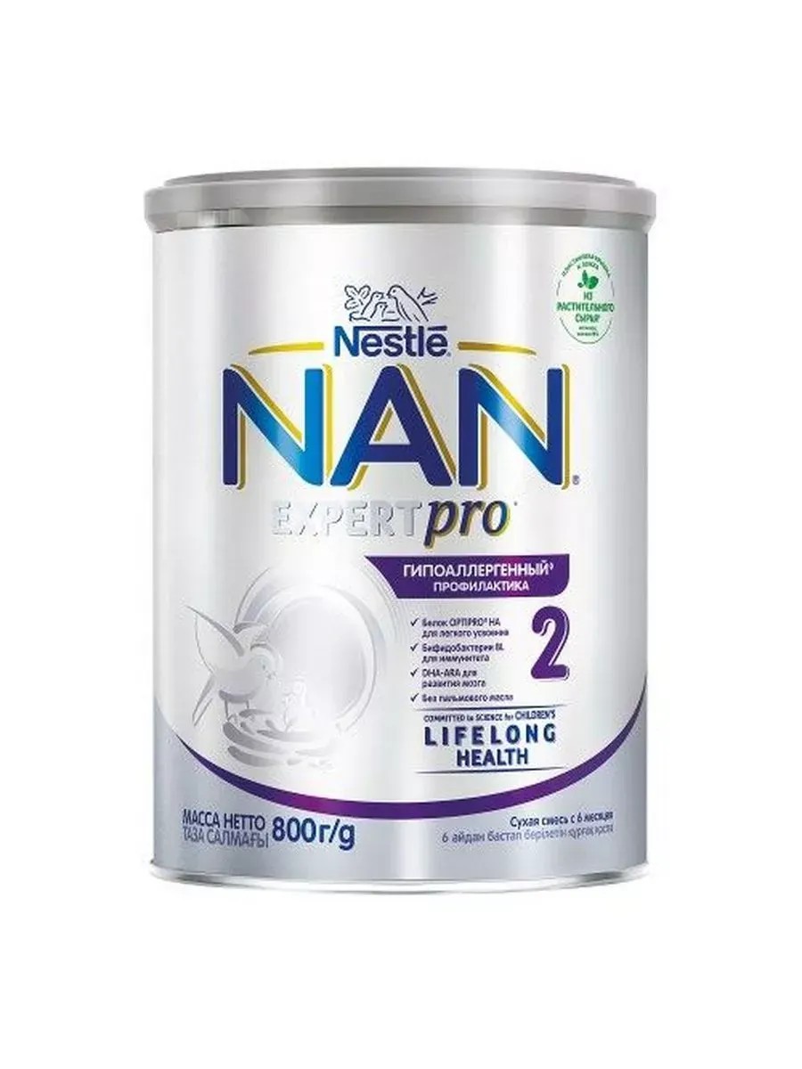 NAN 2 OPTIPRO HA HYPOALLERGENIC DRY MILK FOR CHILDREN 6 MONTHS AND UP 800.00 NAN Hypoallergenic 2 OPTIPRO formula is specifically designed for transitioning from NAN Hypoallergenic 1 OPTIPRO formula. However, it should not be used without consulting a doctor if your baby already has an allergy to cow's milk proteins. The introduction of another formula, as well as cow's milk, should be carried out under the supervision of a healthcare professional. OPTIPRO HA is an optimized, partially hydrolyzed protein complex obtained using a special technology. It has a significantly reduced allergenicity and, as a result, reduces the risk of developing allergies. Live bifidobacteria BL help train and develop your baby's immune system. DHA and ARA - polyunsaturated fatty acids present in breast milk, play an important role in the formation of the baby's immune system and contribute to the development of the brain and vision. The product is made from raw materials produced by specially selected suppliers, without the use of genetically modified ingredients, preservatives, colors and flavors. Nutritional value in 100 ml of ready-made mixture The product is made from raw materials produced by specially selected suppliers, without the use of genetically modified ingredients, preservatives, colors and flavors. Does not contain: GMOs, Artificial colors, Flavors, Preservatives, Palm oil Caloric value / Energy value 67 kcal / 281 kJ * Osmolality 264 mOsm / kg Main components Proteins 1.27 gFat 3.08 gCarbohydrates 8.54 gLactose 4.95 gFatty acidsLinolenic acid (14% of total fat) 0.47 gA-linolenic acid 56.90 mgArachidonic acid 5.69 mgDecosahexaenoic acid (DHA) 5.69 mgMineralsAsh 0.39 gSodium 25.00 mgPotassium 70.50 mgChlorides 58.30 mgCalcium 82.70 mgPhosphorus 50.20 mgMagnesium 7.46 mgManganese 14.90 μgSelenium 2.30 μgIron 1.00 mgIodine 9.49 μgCopper 0.05 mgZinc 0.62 mgVitaminsVitamin A 231.00 IU/MOVitamin A 69.17 mcg retinol eqVitamin D 36.00 IU/