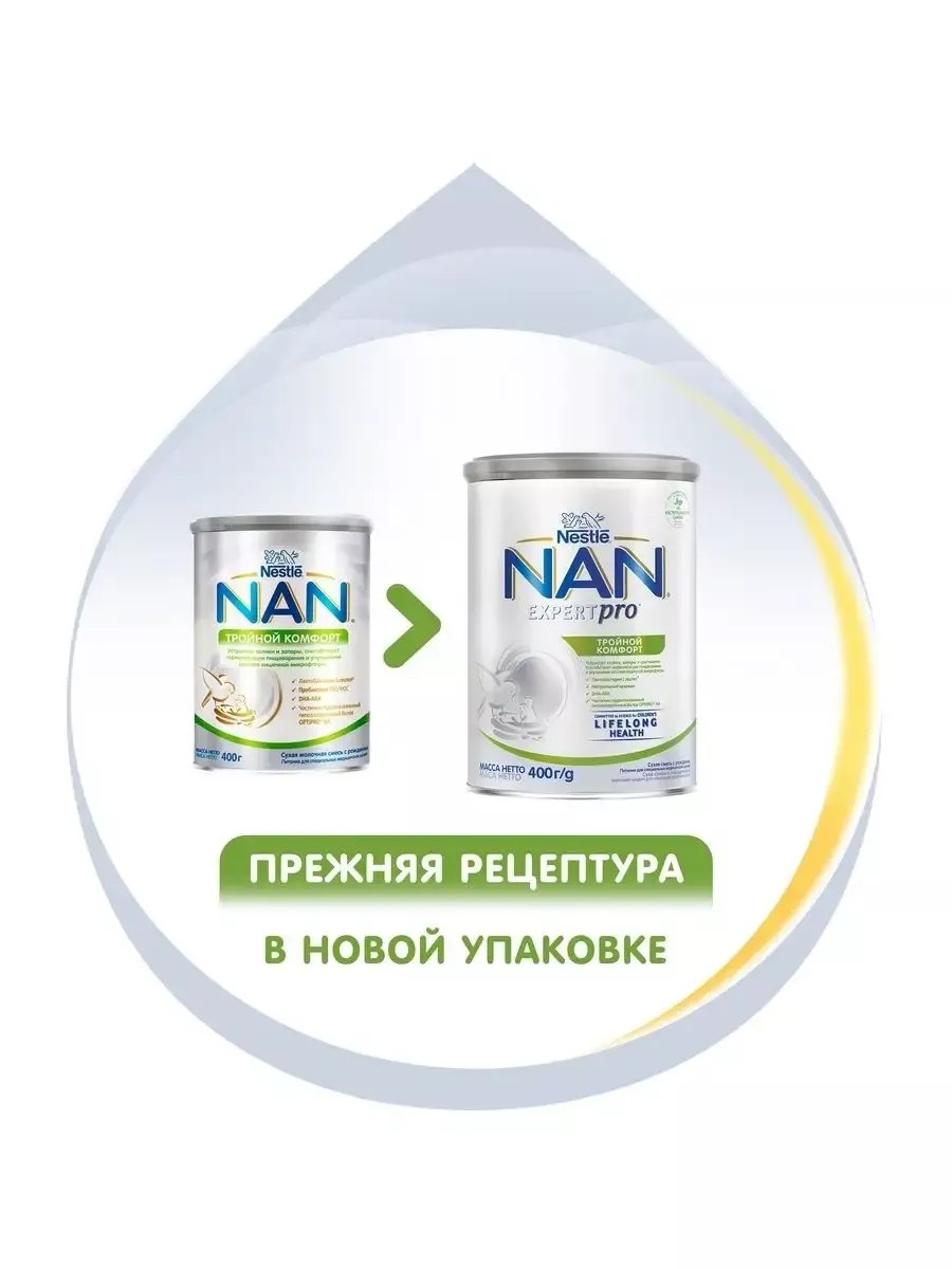 Nan тройной комфорт смесь сухая для детей с рождения - питание, предназначенное для устранения основных симптомов функциональных расстройств пищеварения. Благодаря особой комбинации компонентов смесь NAN Тройной комфорт: способствует устранению младенческих кишечных колик и запоров; нормализует пищеварение; способствует улучшению состава кишечной микрофлоры. Смесь не предназначена для использования в случае аллергии на белки коровьего молока (или подозрении на нее). Не для парентерального (внутривенного) использования. Продукт изготовлен из сырья, произведенного специально отобранными поставщиками без использования генетически модифицированных ингредиентов, консервантов, красителей и ароматизаторов. Перед применением рекомендуется проконсультироваться с врачом.
