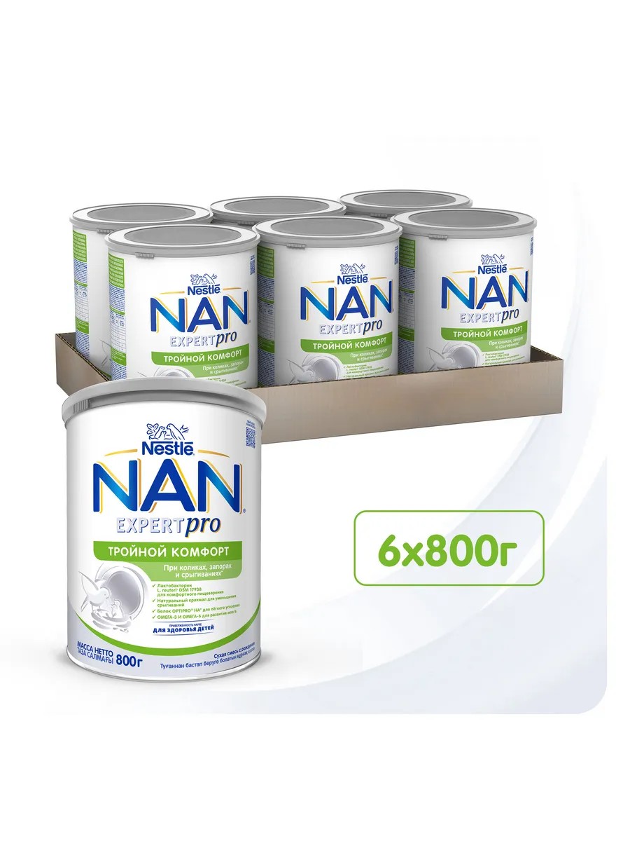 Смесь NAN Тройной комфорт – питание, предназначенное для устранения основных симптомов функциональных расстройств пищеварения. Подходит для использования в качестве единственного источника питания для детей с рождения. Смесь обеспечит ребенка всеми питательными веществами, необходимыми для его оптимального роста и развития. Благодаря особой комбинации компонентов смесь NAN Тройной комфорт способствует устранению младенческих запоров и срыгиваний, нормализует пищеварение, а также способствует улучшению состава кишечной микрофлоры.