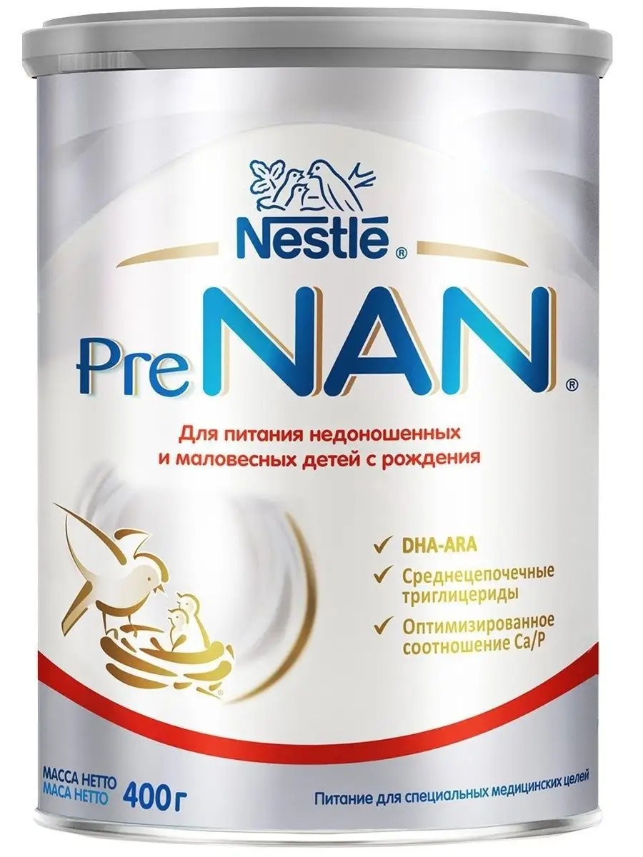 Сухая молочная смесь для питания недоношенных и маловесных детей. Она обеспечит повышенные потребности недоношенного ребенка в питательных веществах, необходимых для быстрого роста и развития. Смесь PreNAN предназначена для кормления недоношенных и маловесных детей. Смесь для недоношенных и маловесных детей PreNAN :- благодаря белку высокого качества, адаптированному к потребностям недоношенных детей, смесь легко переваривается и усваивается, обеспечивая оптимальный рост;- Содержит DHA, ARA - специально разработанную смесь ненасыщенных жирных кислот DHA (омега-3) и ARA (омега-6), которая способствует укреплению иммунной системы малыша и важна для развития мозга и зрения;- Сбалансированное соотношение кальция и фосфора обеспечивает оптимальное развитие костной ткани. Идеальной пищей для грудного ребенка является молоко матери. Перед тем как принять решение об искусственном вскармливании с использованием детской смеси, обратитесь за советом к медицинскому работнику.