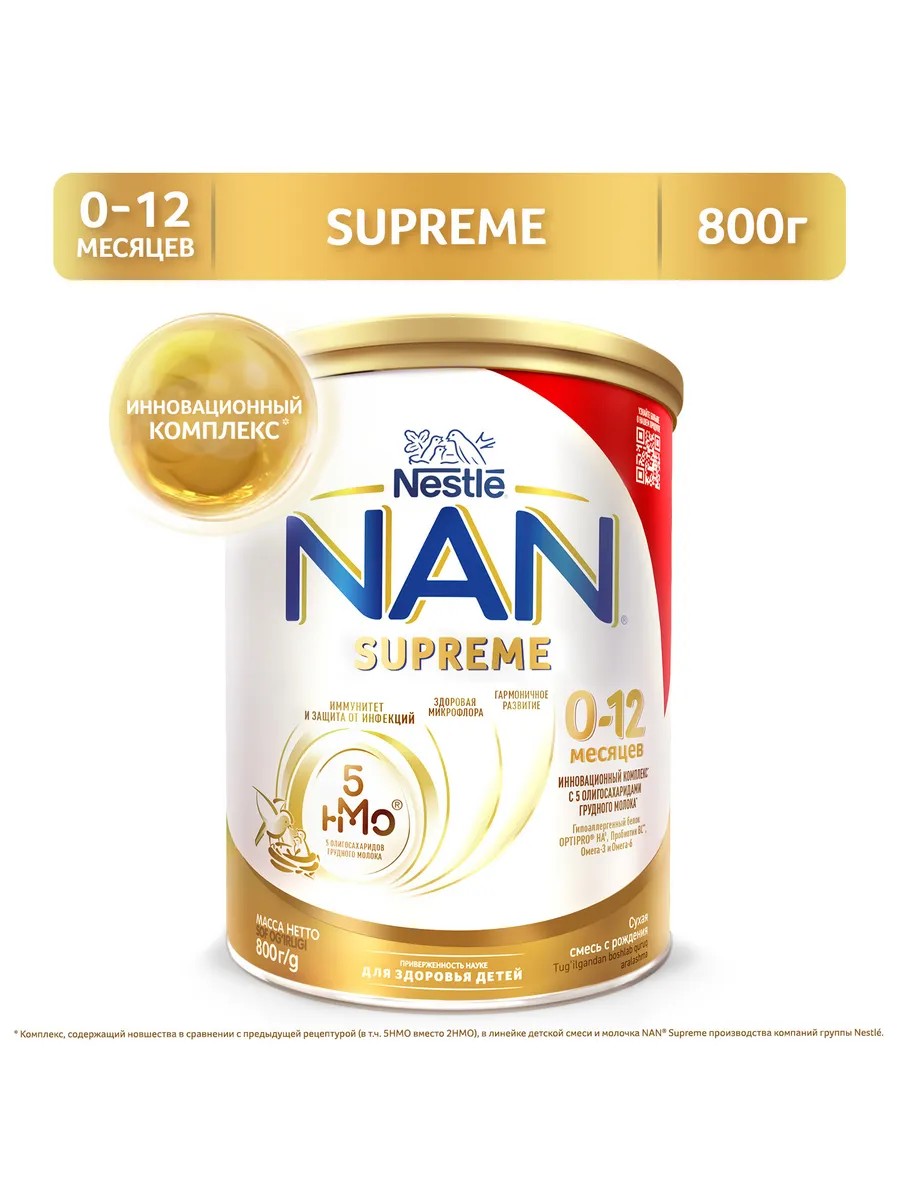 Детская смесь NAN SUPREME с инновационным комплексом с 5 олигосахаридами грудного молока разработана для детей в возрасте от 0 до 12 месяцев.
