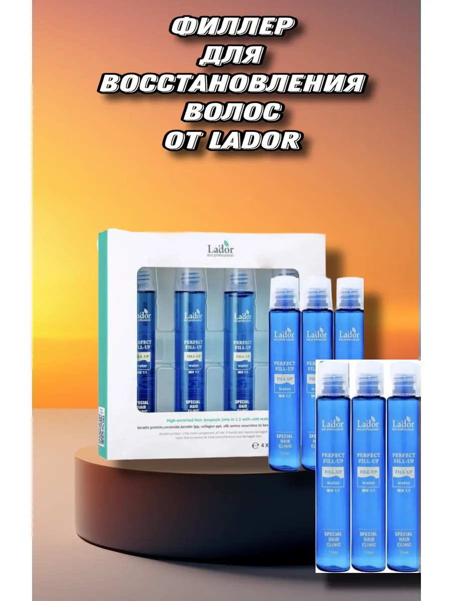 La’dor Perfect Hair Fill-Up (10 шт) — это набор концентрированных ампульных филлеров для быстрого восстановления структуры поврежденных в результате окрашивания, химических и термических воздействий волос. Средство «наполняет» локоны, возвращая им здоровый блеск, эластичность и шелковистость, нормализует pH баланс кожи, избавляя от раздражений, ощущения сухости, зуда. Результат от использования средства сравним с эффектом от салонных процедур и замен уже после первого применения. Ощущение сухих кончиков исчезнет: локоны станут глубоко увлажненными, упругими и совершенно здоровыми! Состав продукта В состав филера вошли компоненты, которые начинают действовать мгновенно и обеспечивают быстрый устойчивый результат: Кератин. Кератин восстанавливает и увлажняет волосы, возвращает им шелковистость; протеины шелка восстанавливают водный баланс, активизируют выработку коллагена организмом. Коллаген. Коллаген заботится о корнях волос, упрощает расчесывание и укладку, восстанавливает структурную целостность волос. Керамиды. Керамиды повышают прочность локонов, укрепляя оболочку волоса. Протеин. Протеин делает волосы эластичными и сияющими, защищает от негативных внешних воздействий. Преимущества использования Длительный эффект. Филлеры сохраняют свой эффект в течении 72 часов, поддерживая гладкость, мягкость и ухоженный вид ваших волос. Восстаналивающий эффект. Филлер содержит аминокислоты, которые являются строительным материалом для волос, восстанавливая их упругость и эластичность. Глянцевый эффект. Филлеры моментально полируют и разглаживают волосы, создавая эффект глянцевых локонов. Для проведения одной процедуры вам потребуется от одной до трех ампул по 13 мл. в зависимости от длины и густоты волос.