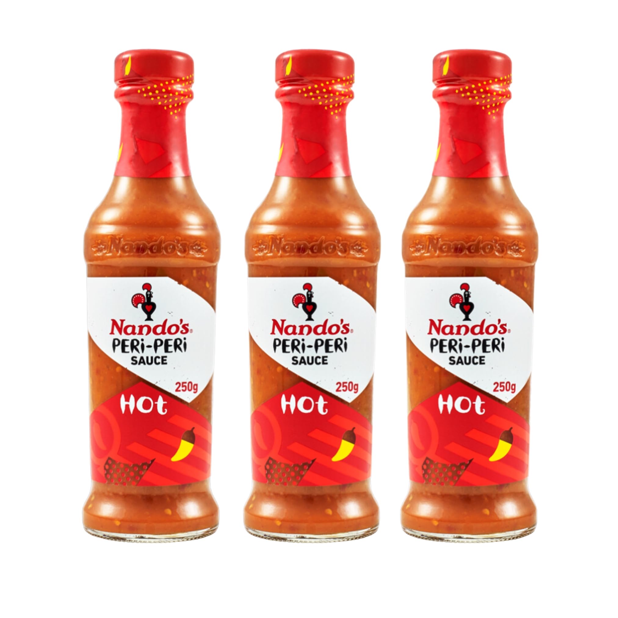 Sustainable Sourcing: Made with chilies grown by local farmers, this sauce supports communities while delivering authentic flavor, with no preservatives or artificial flavors. Versatile Use: Delicious with chicken, fish, rice, or vegetables. Pour, dip, marinate, or use as a topping on sandwiches, soups, or eggs. Diet-Friendly: This gluten-free hot sauce is Halal and Kosher certified, making it ideal for vegetarians and those who enjoy healthy eating. Quality Ingredients: Made with African Bird's Eye chilies, garlic, fresh lemon, and spices. A balanced and flavorful recipe with no unnecessary additives. Burst of Spicy Flavors: With its intense and fiery heat, this Nando's PERi-PERi sauce adds just the right amount of spice to all your dishes. Transform your everyday meals into truly memorable taste experiences.Approvisionnement durable : Fabriquée à partir de piments cultivés par des producteurs locaux, cette sauce soutient les communautés tout en offrant un goût authentique, sans conservateurs ni arômes artificiels. Utilisation multiple : Délicieuse avec du poulet, du poisson, du riz ou des légumes. À verser, tremper, mariner ou utiliser comme garniture sur des sandwichs, des soupes ou des œufs. Adaptée à tous les régimes : Sauce piquante sans gluten, certifiée Halal et Casher, idéale pour les végétariens et les amateurs de cuisine saine. Ingrédients de qualité : Préparée à base de piments African Bird's Eye, d'ail, de citron frais et d'épices. Une recette équilibrée et savoureuse, sans additifs superflus. Explosion de saveurs pimentées : Avec sa chaleur intense et relevée, cette sauce PERi-PERi Nando's apporte juste ce qu'il faut de piquant à tous vos plats. Transformez vos repas du quotidien en véritables expériences gustatives.Nando's Sauce PERi-PERi Piquante - Sauce Pimentée Hot - Lot de 3 x 250g