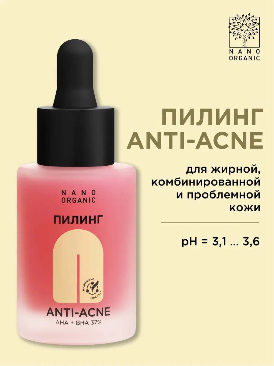 NO Пилинг Anti-Acne (для проблемной кожи), 30 мл. Пилинг для жирной, комбинированной и проблемной кожи с белым углем и фиолетовым бататом. Комплекс кислот: АНА + ВНА = 37% pH = 3,1 ... 3,6. Эффективное очищение пор: миндальная и салициловая кислоты легко проникают в поры, помогая устранить сальные пробки и сократить количество комедонов. Ваша кожа будет выглядеть чище и здоровее. Мощный детокс: Древесный уголь глубоко очищает поры, впитывая излишки кожного жира и делая поры менее заметными. Борьба с воспалениями: Салициловая кислота дезинфицирует поры и уменьшает воспаления, что способствует более чистой и ровной коже. Свежесть и чистота кожи: Высокая концентрация фруктовых кислот делает кожу более гладкой, позволяя ей дышать и предотвращая появление акне. Подавляет размножение Propionibacterium acnes. Выравнивает цвет и тон кожи: помогает выравнивать тон кожи и уменьшать пятна от постакне, придавая вашей коже сияние и здоровый вид. Профессиональный уход: Экстракт фиолетового батата предотвращает появление комедонов и выравнивает текстуру кожи, делая её мягкой и гладкой. Деликатный и безопасный пилинг: Нейтрализованные кислоты обеспечивают мягкое и безопасное воздействие, оставляя вашу кожу свежей и сияющей без раздражений.