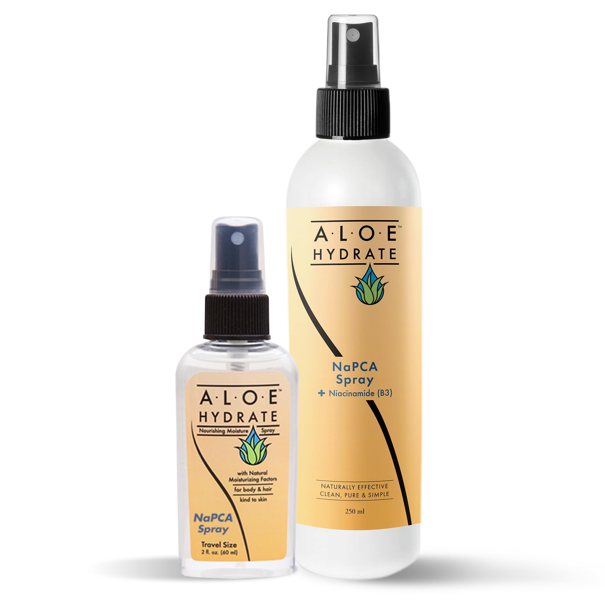Give your skin hydration that works wherever you are. The NaPCA Face Body Hydration Duo pairs our full-size 250 ml mist with a convenient 60 ml travel spray for effortless moisture at home and on the go. Powered by sodium PCA, a key component of the skin's Natural Moisturizing Factor, this lightweight aloe-based mist helps draw and retain moisture for smoother, more comfortable skin. Designed for both face and body, it absorbs quickly with no sticky residue, making it ideal for daily use, post-shower hydration, dry climates, workouts, and travel. This value bundle delivers flexible hydration, clean ingredients, and visible comfort—anytime your skin needs a refresh. AloeHydrate Naturally Effective, Clean, Pure and Simple.