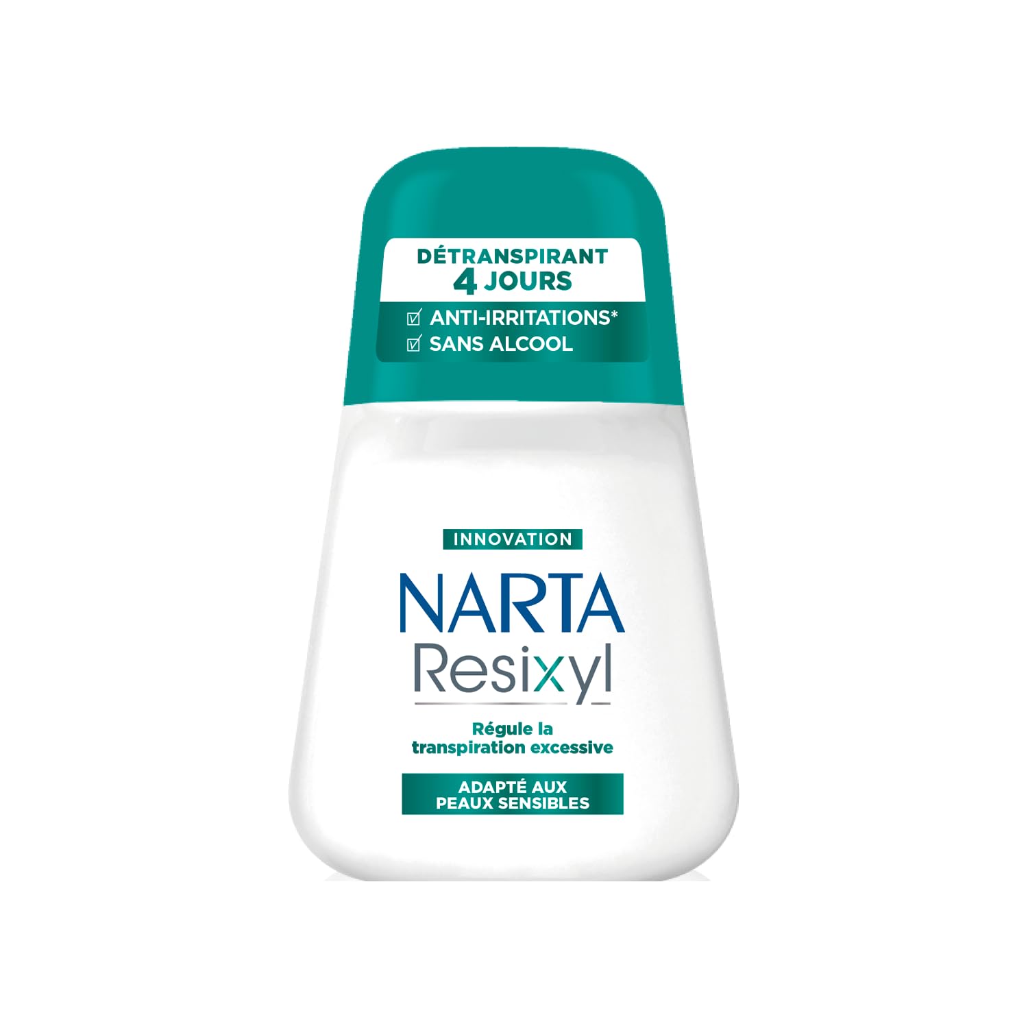 NARTA N 1 DES DÉODORANTS EN FRANCE : Déodorants anti-transpirants. Source : panel IRI, Tous circuits GMS en CAM P6 2024, Marque n 1 en parts de marché volume sur le déodorant. UN DÉTRANSPIRANT À LA TECHNOLOGIE BREVETÉE : Le premier détranspirant de la gamme Narta. Son complexe minéral [Resyx] contient des actifs anti-sudation d'origine minérale. FORMULE 0 ALCOOL : Testé sous contrôle dermatologique. Sa formule anti-irritations est adaptée aux peaux sensibles. L'ultra-efficacité associée à la tolérance optimale, c'est Narta Resixyl. EFFICACITÉ CLINIQUE : Évaluée par des experts. EFFICAITE FORMULE : Approuvée par les testeuses. 95 des femmes à la peau sensible valident son efficacité . Test consommateur sur 80 femmes en fin de journée. INNOVATION NARTA RESIXYL : le premier détranspirant Narta qui régule la transpiration excessive pendant 4 jours. Efficacité 96h : anti-odeurs, anti-humidité et anti-irritations .