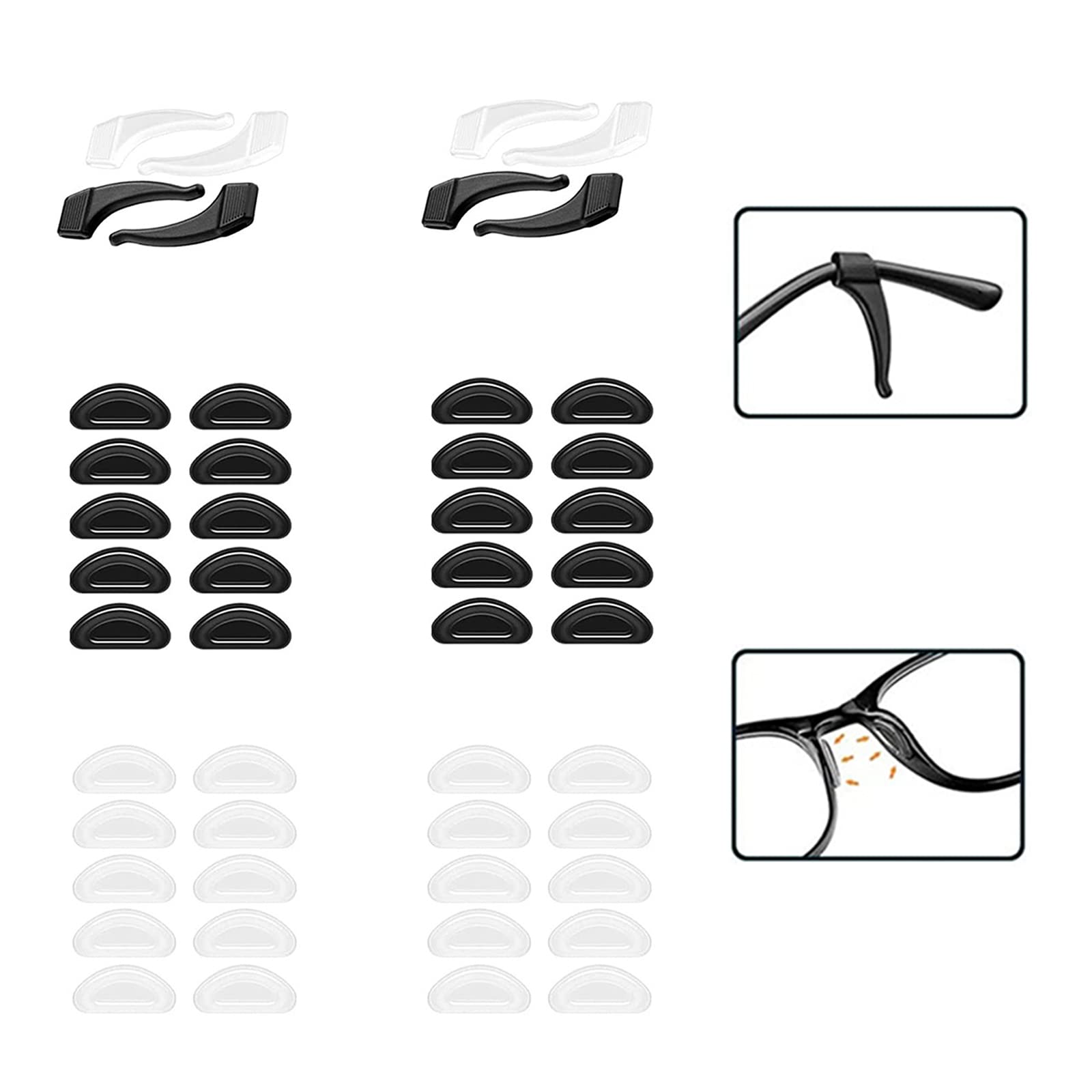 Characteristics: 1st soft and comfortable, non -slip and durable. 2. to stow and carry it in a single -time basis. 3rd to clean and reusable. Specification: Color: white, black Size: 15 * 7 * 1.5 mm / 0.59 * 0.28 * 0.06 inches Weight: 30 g Material: pebbles Scope of delivery: nasal pads silicone*1, anti-slip glasses bracket ears*4 Sufficient quantity: You get 20 pairs of slippery silicone glasses pads + 4 pairs of non-slip glasses bracket, enough for use.Suitable for most glasses frames.Easy to install and remove: glasses with a non -slip frame, easy to stow and transport, easy to install and use at any time.A wide range of applications: universal size fits most glasses, sunglasses, short -sightedness and decorative glasses.Strong liability: The industrial adhesive on the back of the nose pads was specially developed to prevent the glasses from slipping slightly when working or training.Premium material: made of soft silicone material, soft and comfortable, non-slip, durable, easy to clean and reusable. Eigenschaften: 1.Weich und bequem, rutschfest und langlebig. 2.Einfach zu verstauen und zu tragen. 3.Leicht zu reinigen und wiederverwendbar. Spezifikation: Farbe: Weiß,schwarz Größe: 15 * 7 * 1,5 mm / 0,59 * 0,28 * 0,06 Zoll Gewicht: 30 g Material: Kieselgel Lieferumfang: Nasenpads Silikon*1, Antirutsch Brillenbügel Ohrbügel*4Ausreichende Menge: Sie erhalten 20 Paar rutschfeste Silikonbrillen-Nasenpads + 4 Paar rutschfeste Brillenbügel-Ohrbügel, genug für den Gebrauch. Passend für die meisten Brillengestelle. EINFACH ZU INSTALLIEREN UND ZU ENTFERNEN: Brille mit rutschfestem Rahmen, einfach zu verstauen und zu transportieren, einfach zu installieren und jederzeit zu verwenden. Breites Anwendungsspektrum: Universalgröße passt für die meisten Brillen, Sonnenbrillen, Kurzsichtigkeit und dekorative Brillen. Starke Haftung: Der Industriekleber auf der Rückseite der Nasenpads wurde speziell entwickelt, um ein leichtes Abrutschen der Brille beim Arbeiten oder Trainieren zu verhindern. PREMIUM-MATERIAL: Aus weichem Silikonmaterial, weich und bequem, rutschfest, langlebig, leicht zu reinigen und wiederverwendbar.Nasenpads Silikon Brillenpolster Nase Ohrhaken Antirutsch Halterung Rutschfeste Nasenpads Brille Nasenpads Für Brille Anti Rutsch Brille Nasen Pad für Sportbrillen Sonnenbrille Lesebrillen (24 Paar)
