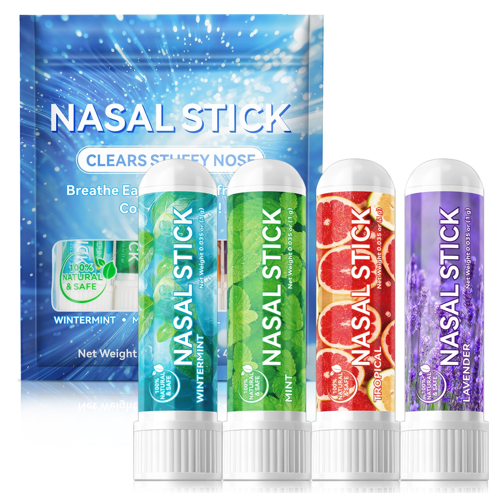 Our Nasal relief Sticks contain only the finest natural ingredients. Each pack features four invigorating sticks infused with Peppermint, Eucalyptus, Menthol, and delightful natural flavors:Mint, Wintermint, Tropical, and Lavender.