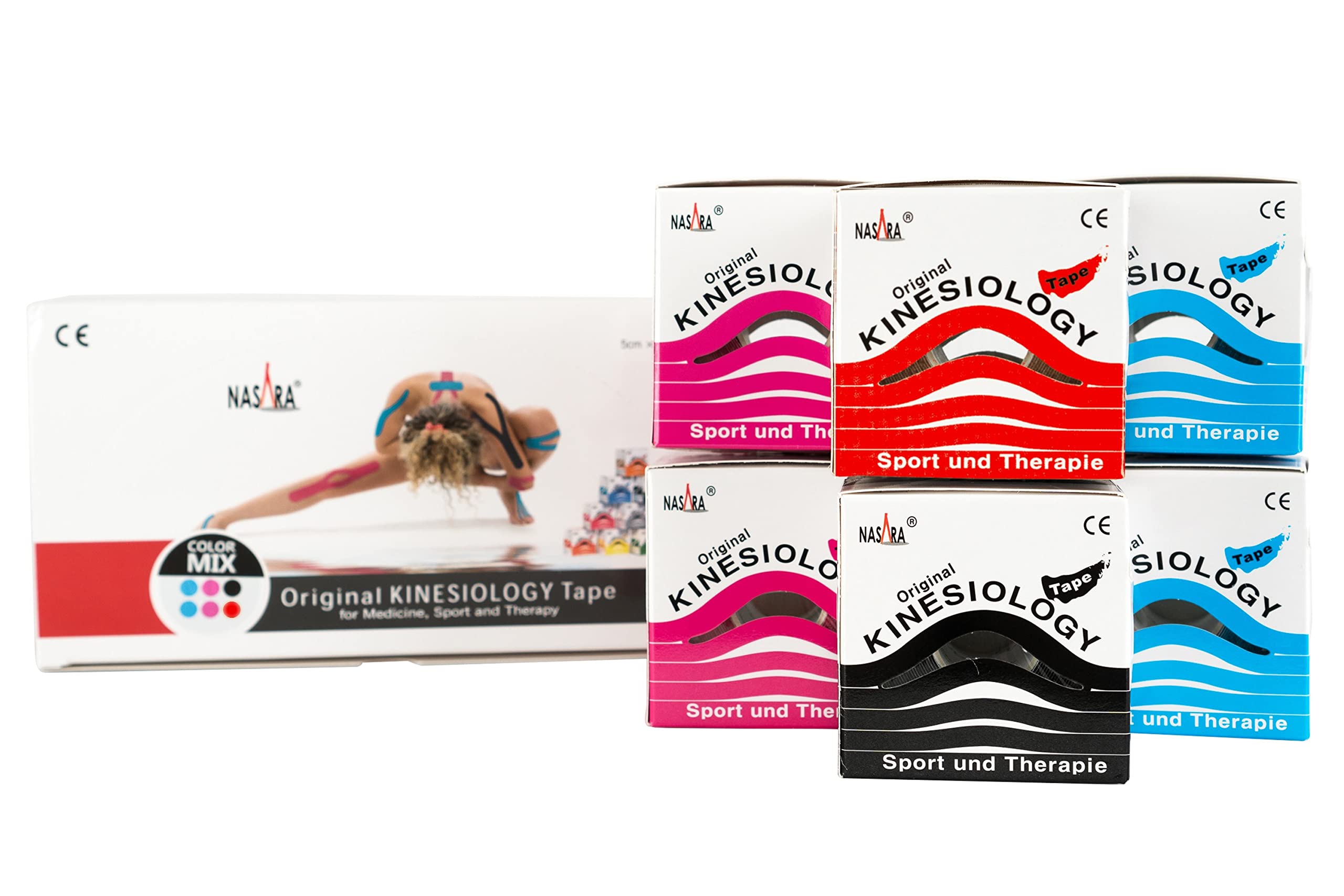 Ideal for professional treatment in sports and/or by therapists and doctors.One of the best known and most successful kinesiology tapes on the market.6 rolls individually in a donor box.Colors: 2x turquoise 2x pink 1x black 1x red.Set of particularly popular colors.Original nasara kinesiology tape roll size 5cm x 5m.