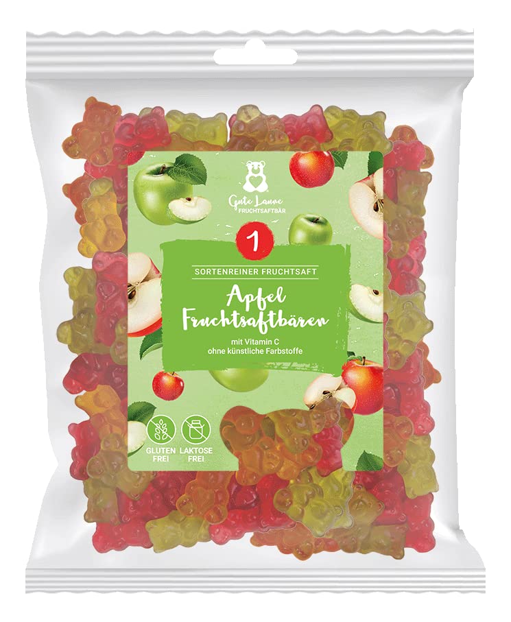 Premium fruit juice bears that taste amazing. The "Gute Laune Fruchtsaftbär" brand stands for 100 authentic enjoyment. All products contain 20 to 40 pure fruit juice. This means that if the fruit type is "cherry" on the package, for example, there is cherry juice in the gummy bear. The gummy candies are therefore not fertilized and are completely free of artificial colors. The fruit juice bear varieties are gluten-free and lactose-free (except for the fruit juice bears on yogurt foam), fat-free, and also contain vitamin C (except for the fruit juice bears on yogurt foam and the special vegan bears). INGREDIENTS Ingredients: glucose syrup, sugar, 20 fruit juice from apple juice concentrate, gelatin, acidifier: citric acid, acerola fruit powder, ascorbic acid (vitamin C), flavourings, colouring foods (carrot, pumpkin, spirulina, safflower and black carrot concentrates), glazing agent: carnauba wax.naschlabor Ours à jus de fruits de bonne humeur Pomme 20 de jus de fruits purs Sans colorants artificiels ni exhausteur de goût Sans gluten ni lactose (500 g) 500gDESCRIPTION DU PRODUIT DESCRIPTION DU PRODUIT Ours à jus de fruits de qualité supérieure que l'on goûte. La marque « Gute Laune Fruchtsaftbär» est synonyme de plaisir 100 authentique. Tous les produits sont composés de 20 à 40 de jus de fruits purs. Cela signifie que si le type de fruit « cerise » est sur le paquet, par exemple, il y a du jus de cerise dans l'ourson gomme. Les bonbons en caoutchouc ne sont donc pas fécondés et sont entièrement sans colorants artificiels. Les variétés d'ours à jus de fruits sont sans gluten et sans lactose (à l'exception des ours à jus de fruits sur mousse de yaourt), non grasses et également avec de la vitamine C (à l'exception des ours à jus de fruits sur mousse de yaourt et des ours spéciaux végétaliens). INGRÉDIENTS Ingrédients : sirop de glucose, sucre, 20 de jus de fruit à base de concentré de jus de pomme, gélatine, acidifiant : acide citrique, poudre de fruits acérola, acide ascorbique (vitamine C), arômes, aliments colorants (concentrés de carotte, citrouille, spiruline, carthame et carotte noire), agent d'enrobage : cire de carnauba.