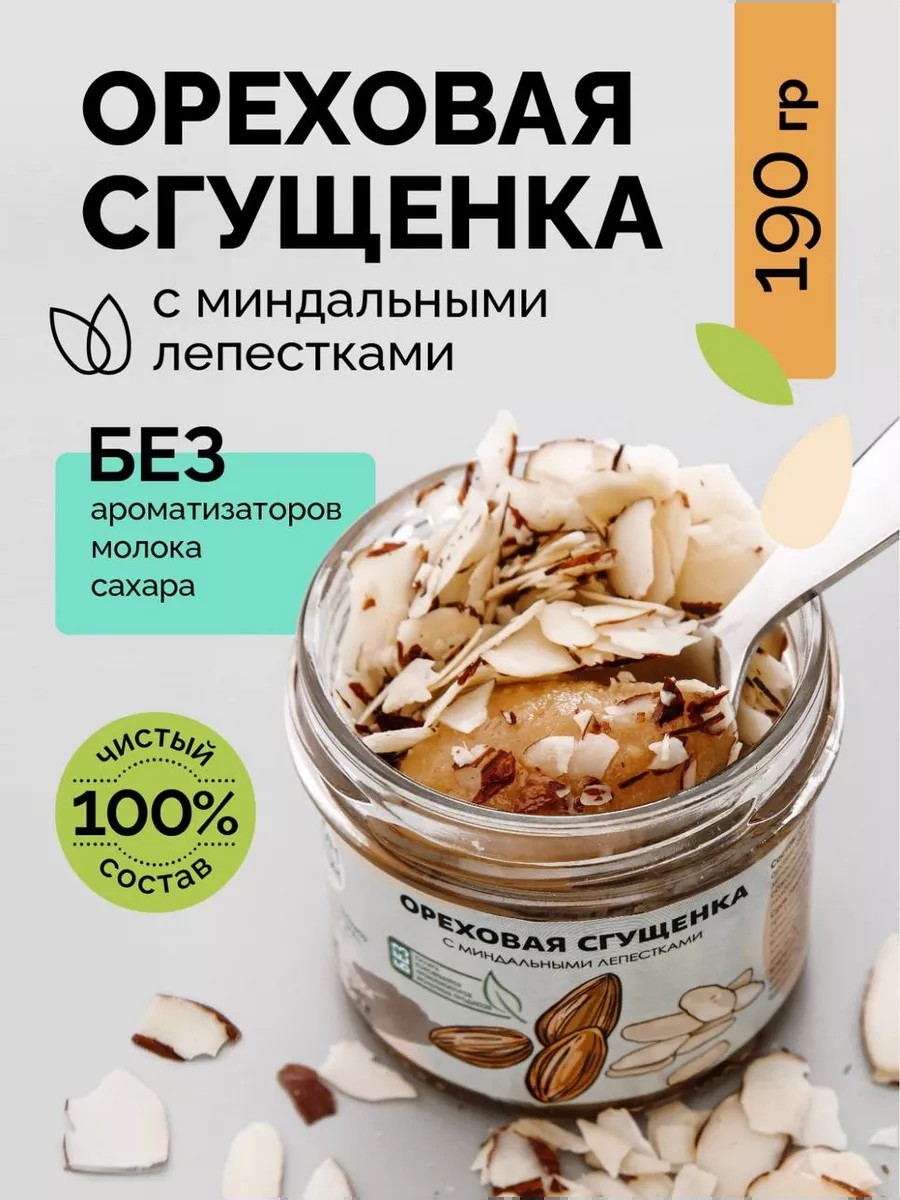 Ореховая сгущенка с миндальными лепестками - полезная сладость. Миндальные лепестки украсят блюдо, а арахис и топинамбур сделают его насыщенным и питательным.
