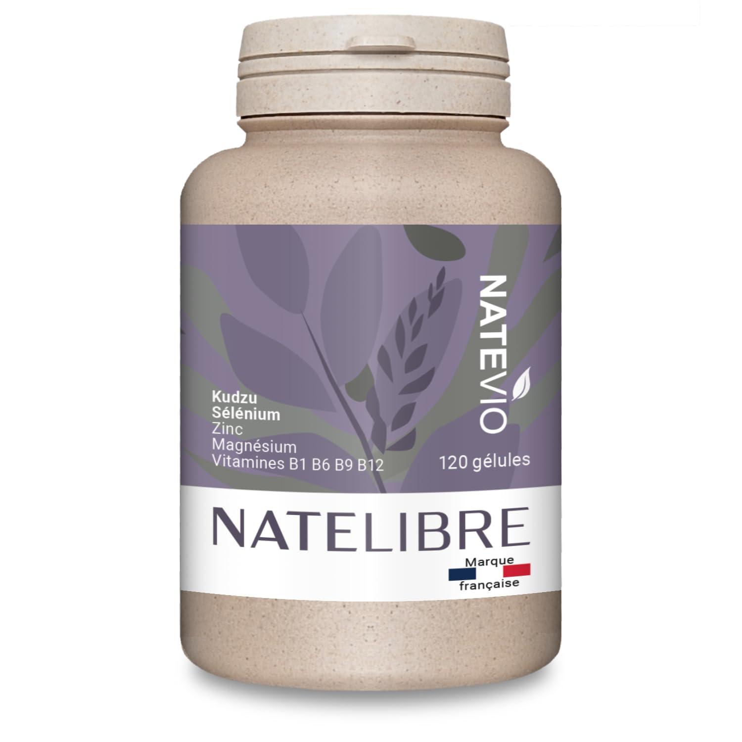 NATELIBRE – Dietary Supplement for Quitting Smoking Nervous System Balance – 120 Capsules With Kudzu, Magnesium, Zinc, Selenium Vitamins B1-B6-B9-B12 ? Natural Support for Quitting Smoking Thanks to the 300 mg Kudzu extract, rich in isoflavones (24 mg), NATELIBRE effectively supports those who wish to reduce or stop their consumption. ? Nervous System Balance Mental Fatigue Magnesium (300 mg) and B vitamins (B1, B6, B9, B12) contribute to the proper functioning of the nervous system and help reduce fatigue. ? Antioxidant Defenses Metabolism Zinc and selenium strengthen natural defenses and contribute to cellular metabolism. Dosage: Take 4 capsules per day, in one or two doses, with a glass of water. Who is it for? For effective and lasting withdrawal during periods of stress, nervous fatigue, or compulsive cravings Composition (per 4 capsules): Kudzu dry extract 300 mg (24 mg isoflavones) Magnesium 300 mg Zinc 13 mg Selenium 55 µg Vitamin B1: 1.07 mg – B6: 1.42 mg – B9: 201 µg – B12: 2.5 µg Vegetable capsule (hypromellose) – GMO-free, gluten-free ? Precautions: For adults only. Not recommended for pregnant or breastfeeding women, or those with a history of breast cancer. Do not exceed the recommended dose. Ingredients per 4 capsules: Kudzu root dry extract (non-EU origin) 300 mg (Isoflavones: 24 mg), Magnesium oxide (Magnesium: 300 mg), Hypromellose capsule (vegetable capsule), Maltodextrin, Zinc gluconate (Zinc: 13 mg), Magnesium stearate, Pyridoxine HCl (Vitamin B6: 1.42 mg), Thiamine HCl (Vitamin B1: 1.072 mg), Folic acid (Vitamin B9: 201 µg), Selenium yeast (Selenium: 55 µg), Cobalamin (Vitamin B12: 2.5 µg)PRECAUTIONS - For adults only. Not recommended for pregnant or breastfeeding women, or women with a personal or family history of breast cancer. FRENCH QUALITY NON-HABIT FORMING – Formulated and manufactured in France according to strict standards a natural, non-habit-forming solution, supported by a dedicated Natevio scientific service. 120 CAPSULES 1 MONTH SUPPLY – Simple dosage: 4 capsules day. Vegetable bottle 100 plant-based capsules, gluten-free and free of animal gelatin, vegan-friendly. MENTAL SUPPORT SLEEP – Selenium and B vitamins promote emotional balance and normal cognitive function, for a smoother withdrawal and restful sleep. REDUCES CRAVINGS IRRITABILITY – Kudzu helps to space out cravings, while magnesium and zinc reduce nervousness, sleep disturbances, and inflammation associated with quitting. FORMULA 8 SYNERGISTIC NATURAL ACTIVE INGREDIENTS ALL IN 1 – Kudzu standardized to 8 isoflavones (300 mg), magnesium, zinc, selenium vitamins B1-B6-B9-B12 for comprehensive withdrawal support.Description du produit NATELIBRE – Complément alimentaire sevrage équilibre nerveux – 120 gélules Avec Kudzu, Magnésium, Zinc, Sélénium Vitamines B1-B6-B9-B12 ? Soutien naturel du sevrage Grâce à l'extrait de Kudzu dosé à 300 mg, riche en isoflavones (24 mg), NATELIBRE accompagne efficacement ceux qui souhaitent réduire ou arrêter leur consommation. ? Équilibre nerveux fatigue mentale Le magnésium (300 mg) et les vitamines B (B1, B6, B9, B12) contribuent au bon fonctionnement du système nerveux et aident à réduire la fatigue. ? Défenses antioxydantes métabolisme Le zinc et le sélénium renforcent les défenses naturelles et participent au métabolisme cellulaire. Posologie : Prendre 4 gélules par jour, en une ou deux prises, avec un verre d'eau. Pour qui ? Pour un sevrage efficace et durable En période de stress, de fatigue nerveuse ou d'envies compulsives Composition (pour 4 gélules) : Kudzu extrait sec 300 mg (24 mg isoflavones) Magnésium 300 mg Zinc 13 mg Sélénium 55 µg Vit. B1 : 1,07 mg – B6 : 1,42 mg – B9 : 201 µg – B12 : 2,5 µg Gélule végétale (hypromellose) – Sans OGM, sans gluten ? Précautions : Réservé à l'adulte. Déconseillé aux femmes enceintes, allaitantes ou avec antécédents de cancer du sein. Ne pas dépasser la dose recommandée. Ingrédients Ingrédients pour 4 gélules : Extrait sec de racine de Kudzu (origine Non UE) 300 mg (Isoflavones : 24 mg), Oxyde de Magnésium (Magnésium : 300 mg), Gélule hypromellose (tunique végétale), Maltodextrine, Gluconate de Zinc (Zinc : 13 mg), Stéarate de magnésium, Pyridoxine HCl (Vitamine B6 : 1,42 mg), Thiamine HCl (Vitamine B1 : 1,072 mg), Acide folique (Vitamine B9 : 201 µg), Sélénium levure (Selenium : 55 µg), Cobalamine (vitamine B12 : 2,5 µg)PRECAUTIONS - Réservé à l'adulte, Déconseillé aux femmes enceintes ou allaitantes ainsi qu'aux femmes présentant des antécédents personnels ou familliaux de cancer du sein. QUALITÉ FRANÇAISE SANS ACCOUTUMANCE – Formulé et fabriqué en France selon des normes strictes solution naturelle sans dépendance, accompagnée d'un service scientifique Natevio dédié. 120 GÉLULES 1 MOIS DE CURE – Posologie simple : 4 gélules jour. Flacon végétal gélules 100 végétales, sans gluten ni gélatine animale, compatibles vegan. SOUTIEN PSYCHIQUE SOMMEIL – Sélénium et vitamines B favorisent équilibre émotionnel et fonctions cognitives normales, pour un sevrage plus serein et un sommeil réparateur. RÉDUIT LES ENVIES L'IRRITABILITÉ – Le kudzu aide à espacer les impulsions, tandis que magnésium et zinc diminuent nervosité, troubles du sommeil et inflammation liée à l'arrêt. FORMULE 8 ACTIFS NATURELS SYNERGIQUES TOUT EN 1 – Kudzu titré 8 isoflavones (300 mg), magnésium, zinc, sélénium vitamines B1-B6-B9-B12 pour un soutien global du sevrage.Natelibre - 120 gélules - Complexe Renforcé 8 actifs (Kudzu - Zinc - Magnésium - Selenium - Vit B1 B6 B9 B12) Sevrage efficace - Complément alimentaire stress - Fabriqué en France