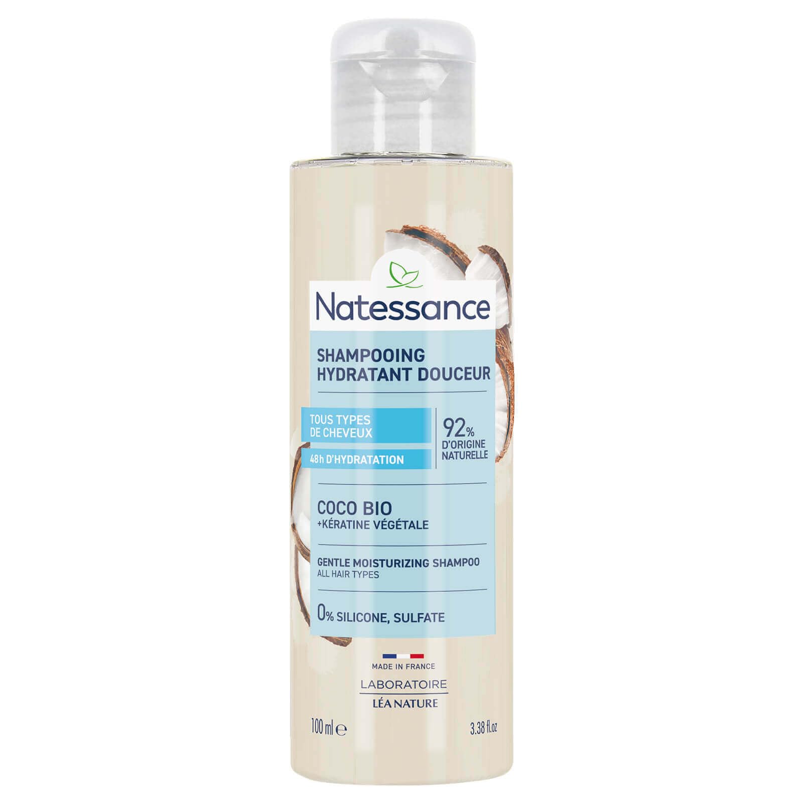 Natessance Coconut and Plant Keratin Shampoo 100ml is a shampoo with coconut oil and keratin, ideal for the care of sensitized and weakened hair. Directions for use: Apply this shampoo to wet hair, massage gently, then rinse. In case of contact with eyes, rinse thoroughly. Do not dispose of directly in nature. Apply to wet hair, massage gently, then rinse thoroughly. In case of contact with eyes, rinse thoroughly. INGREDIENTS Aqua (Water), Cocamidopropyl Betaine, Glycerin, Cetrimonium Chloride, Sodium Chloride, Decyl Glucoside, Sorbitan Caprylate, Cetearyl Alcohol, Cocos Nucifera (Coconut) Oil, Hydroxypropyl Guar Hydroxypropyltrimonium Chloride, Hydrolyzed Wheat Protein, CI77891 (Titanium Dioxide), Lactic Acid, Oryza Sativa (Seed) Protein, Phytic Acid, Sodium Benzoate, Benzyl Salicylate, Oryza Sativa (Rice Hull Powder) Extract, Gluconolactone, Tocopherol, Sodium Hydroxide, Calcium Gluconate, Helianthus Annuus (Sunflower) Seed Oil. DIRECTIONS FOR USE Apply to wet hair, massage gently, then rinse thoroughly. In case of contact with eyes, rinse immediately. See moreFormulated without sulfates, parabens, or silicones. 96 Natural origin. Coconut and plant-based keratin.Natessance - Shampooing extra-doux - brillance - Coco Kératine végétale - usage fréquent 100mlDESCRIPTION DU PRODUIT DESCRIPTION DU PRODUIT Natessance shampooing coco et kératine végétale 100 ml est un shampooing à l'huile de coco et à la kératine, idéal pour le soin des cheveux sensibilisés et fragilisés. Conseils d'utilisation appliquez ce shampooing sur cheveux humides, massez en douceur puis rincez. En cas de contact avec les yeux, rincez abondamment. Ne pas jeter directement dans la nature. Appliquez sur cheveux mouillés, massez en douceur puis rincez soigneusement. En cas de contact avec les yeux, rincez abondamment. INGRÉDIENTS Aqua (Water), Cocamidopropyl Betaine, Glycerin, Cetrimonium Chloride, Sodium Chloride, Decyl Glucoside, Sorbitan Caprylate, Cetearyl Alcohol, Cocos Nucifera (Coconut) Oil, Xanthan Gum, Coco-Caprylate, Benzyl Alcohol, Sodium Cocoyl Glutamate, Parfum (Fragrance), Dicaprylyl Ether, Sodium Levulinate, Lauryl Alcohol, Hydroxypropyl Guar Hydroxypropyltrimonium Chloride, Hydrolyzed Wheat Protein, CI77891 (Titanium Dioxide), Lactic Acid, Oryza Sativa (Seed) Protein, Phytic Acid, Sodium Benzoate, Benzyl Salicylate, Oryza Sativa (Rice Hull Powder) Extract, Gluconolactone, Tocopherol, Sodium Hydroxide, Calcium Gluconate, Helianthus Annuus (Sunflower) Seed Oil. MODE D'EMPLOI Appliquer sur cheveux mouillés, masser doucement puis rincer soigneusement. En cas de contact avec les yeux, rincer Voir plusFormulé sans sulfate, sans parabène, sans silicone. 96 D'origine naturelle. Coco et kératine végétale.