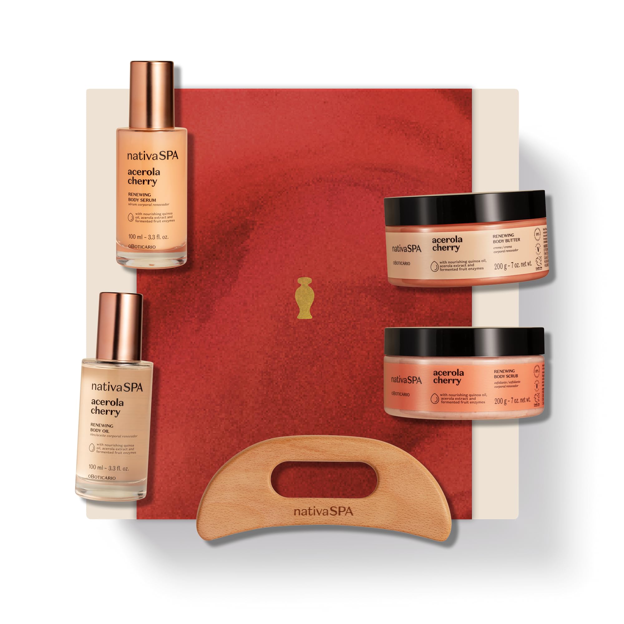 Elevate Your Skincare Routine: With Nativa SPA's eco-friendly formulas. Cozy rituals to keep your skin radiant and nourished. Enriched with 100 pure quinoa oil, omegas, nutrients, and benefits you can feel. Vegan, cruelty-free. Fresh Fragrance: From smooth to silky, feel radiant at every step with the uplifting scent of Acerola Cherry for a festive, zesty fresh vibe. A holiday gift set, self care gift or winter hydration. Antioxidant Rich: Acerola Cherry boosts skin vitality with powerful antioxidants, providing a silky smooth Finish. Experience deeply nourished, radiant skin every day. Featuring: Energizing Body Serum (100ml), Deeply Moisturizing Body Oil (100ml), Body Butter (200g), Renewing Body Scrub (200g) Gua Sha tool. This set is powered by the antioxidant-rich Acerola Cherry Extract to illuminate and restore skin vitality. Complete Skincare: Elevate your body care routine with the Nativa SPA Acerola Cherry Radiant Ritual Set for your best radiant glowing skin care results.