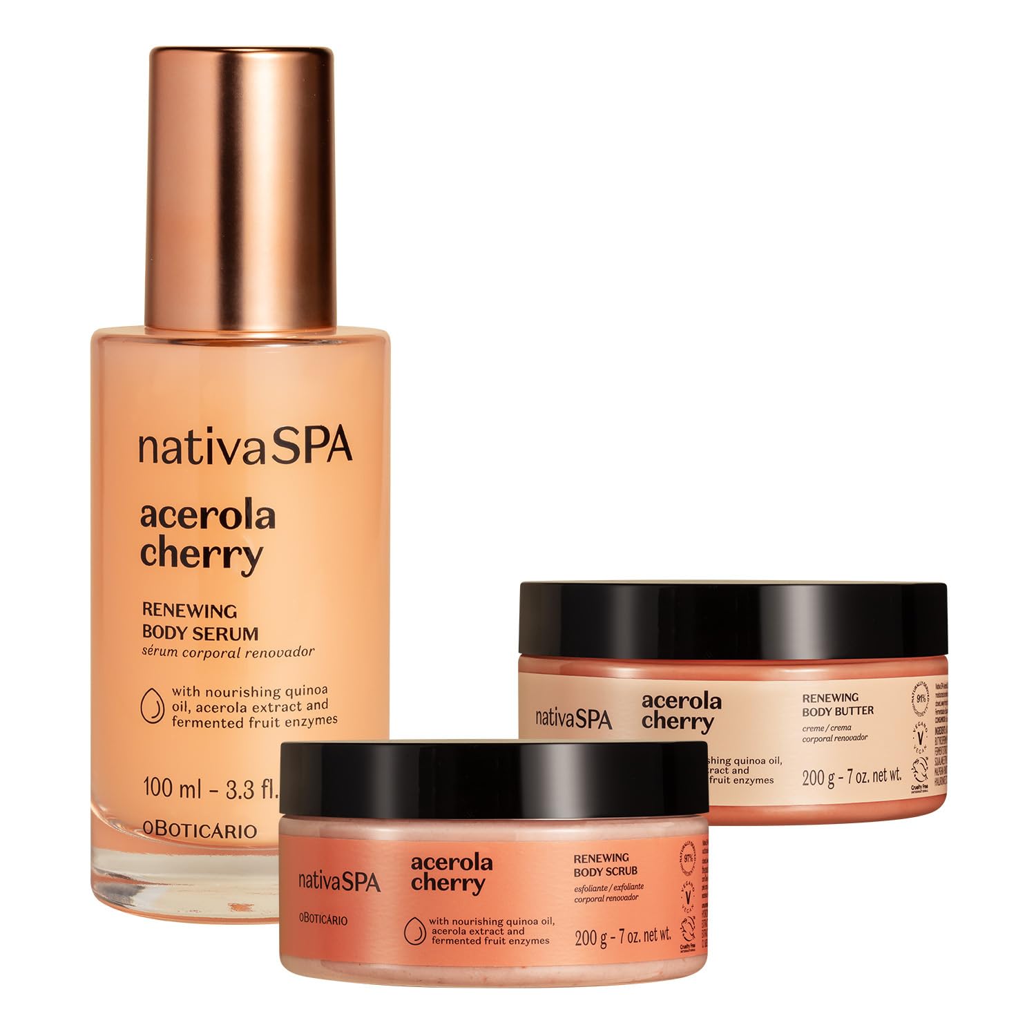 Nourishing Ingredients: Infused with Pure Quinoa Oil to care for your skin. Consciously formulated vegan cruelty-free. Acerola Cherry Renewing Body Scrub: Provides a gentle exfoliation: Combines lactic acid (AHA), quartz powder fermented fruit enzymes to remove dead skin cells. Smooth texture polishes refines skin for a renewed look feel. Acerola Cherry Renewing Body Serum: With a weightless hydration: A lightweight formula delivers long-lasting moisture radiant glow. Acerola extract restores natural vibrancy to skin. Acerola Cherry Renewing Body Butter: Provides Intense Hydration: Combines shea butter and Pure Quinoa Oil for deep moisturization smoother skin. A velvety, creamy formula absorbs quickly for all-day comfort. Nativa SPA Acerola Cherry Ritua Bundle to renewed hydrate your skin. Includes: Body Butter (200 g), Serum (100 ml), Scrub (200 g).