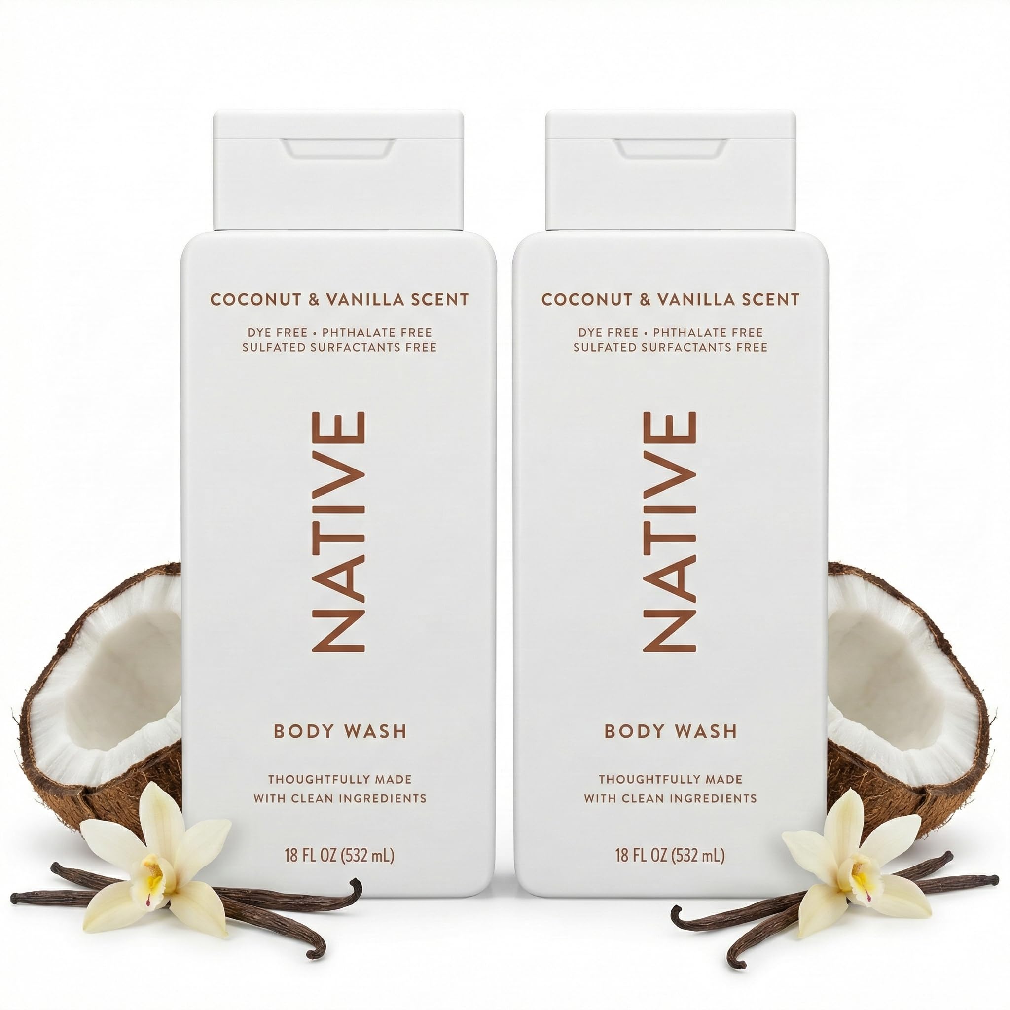Refresh Your Shower Routine with Native Coconut Vanilla Body Wash Upgrade your daily shower with Native Body Wash in our bestselling Coconut Vanilla scent. This 2 pack gives you 36 total ounces of rich, creamy lather that cleanses without stripping your skin of natural moisture. Made with naturally derived ingredients and free from sulfates, parabens, and phthalates, Native delivers a gentle yet effective clean you can feel good about. Why Customers Love Native Body Wash Our coconut and vanilla formula transforms your shower into a spa-like experience. The tropical coconut blends perfectly with warm vanilla notes to create a clean, lasting scent that lingers on skin throughout the day. Whether you have dry skin, sensitive skin, or just want a body wash that actually moisturizes, Native works for all skin types without irritation. Clean Ingredients You Can Trust We believe what you put on your body matters. Native Body Wash is cruelty free, vegan friendly, and made without harsh chemicals. Our gentle formula includes coconut oil and vitamin E to nourish and hydrate while you cleanse. No artificial dyes. No questionable ingredients. Just an effective natural body wash that leaves skin feeling soft, smooth, and refreshed. Perfect for the Whole Family This unisex shower gel works great for women and men looking for a sulfate free body wash alternative. Stock up with our value 2 pack and keep one in your master bath and one in the guest bathroom, or share with your partner. At 18 oz per bottle, you get weeks of luxurious lathers from each bottle.