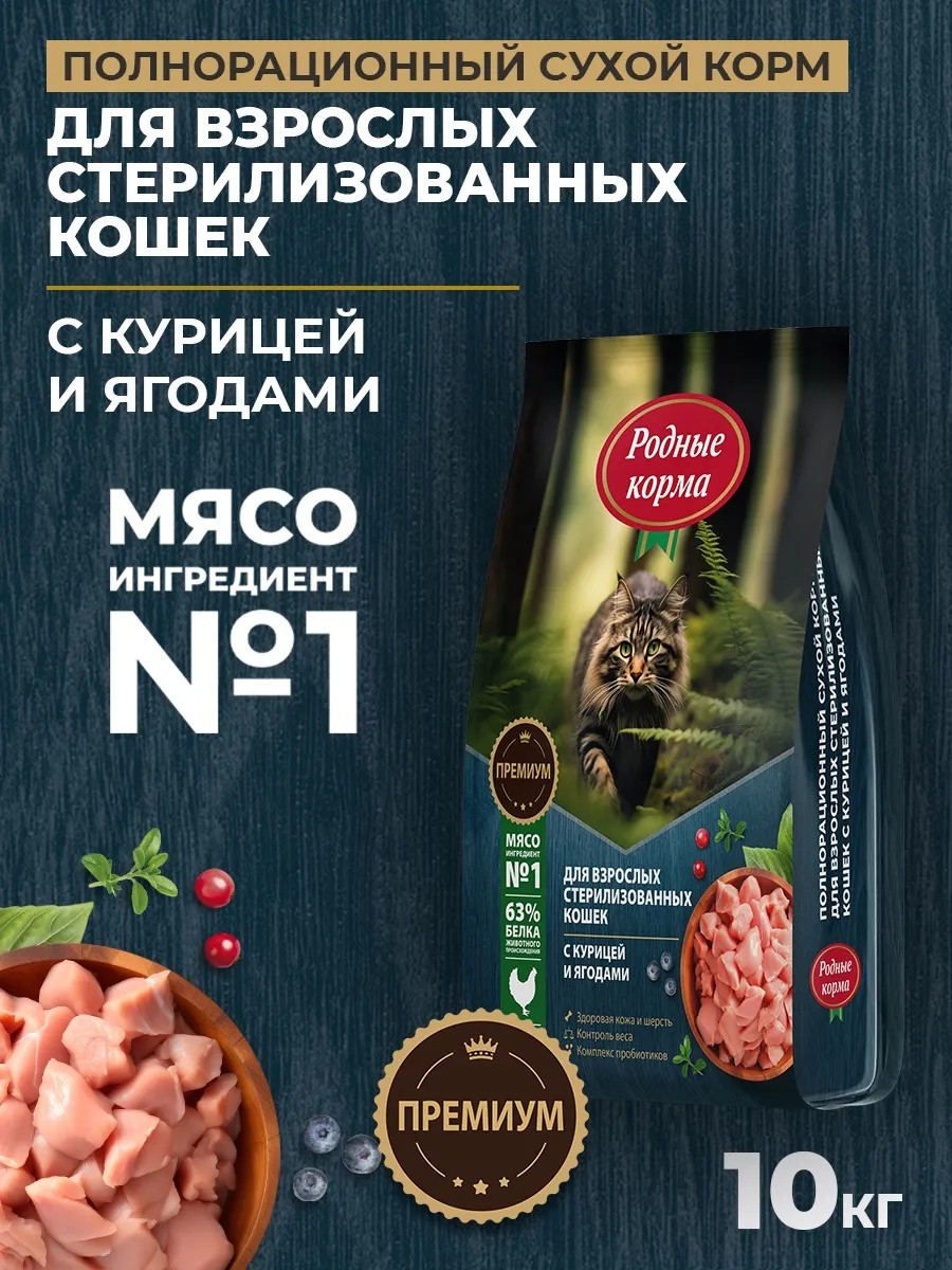 Родные корма Сухой корм для стерилизованных кошек с курицей, 10 кг