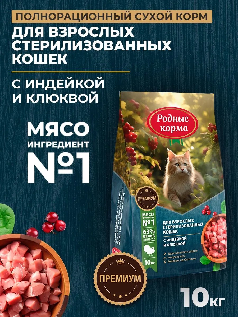 Родные корма Сухой корм для стерилизованных кошек с индейкой, 10 кг