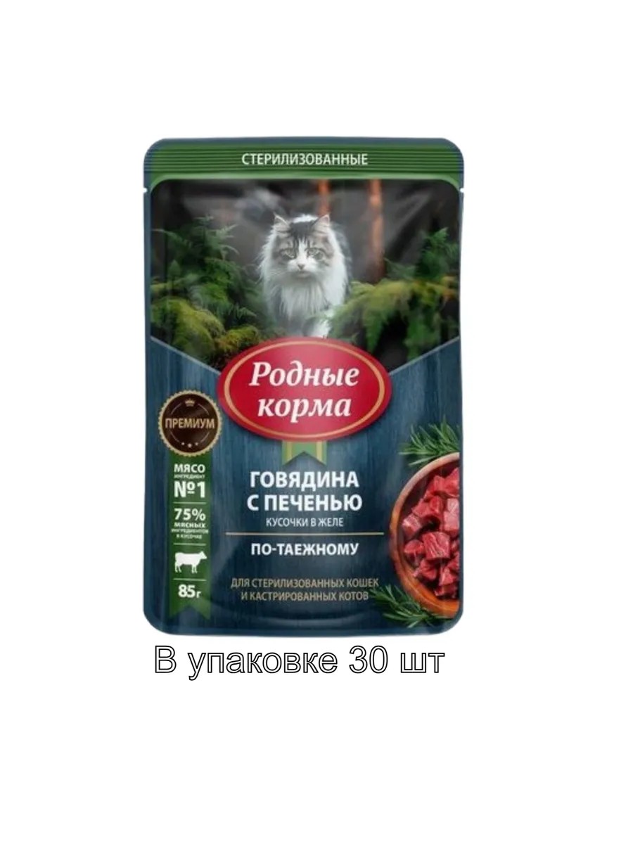 Родные корма, пауч, для стерилизованных кошек и кастрированных котов с говядиной и печенью кусочки в желе по-таежному, 85 г., 30 шт. Влажный корм для кошек — это забота о здоровье Вашего котика или кошечки, ведь они нуждаются в особом уходе после стерилизации или кастрации. Наш влажный корм для кошек в паучах разработан специально для таких животных, чтобы поддерживать их иммунитет, пищеварение и общее состояние здоровья.