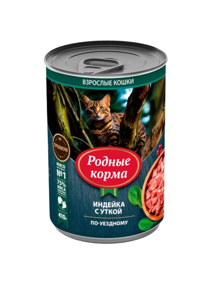 Родные корма, влажный корм для кошек с индейкой и уткой по-уездному, 410 г. Угостите своего любимца необычайно вкусным, полезным и питательным влажным кормом для кошек от торговой марки Родные корма. Полнорационный консервированный корм для кошек - это 75% мяса и мясных ингредиентов в составе, витамины, минералы, рыбий жир и таурин, такие необходимые для здорового и счастливого образа жизни пушистого друга. Консервы для кошек «Родные корма» — это высококачественный корм премиального класса российского производства.