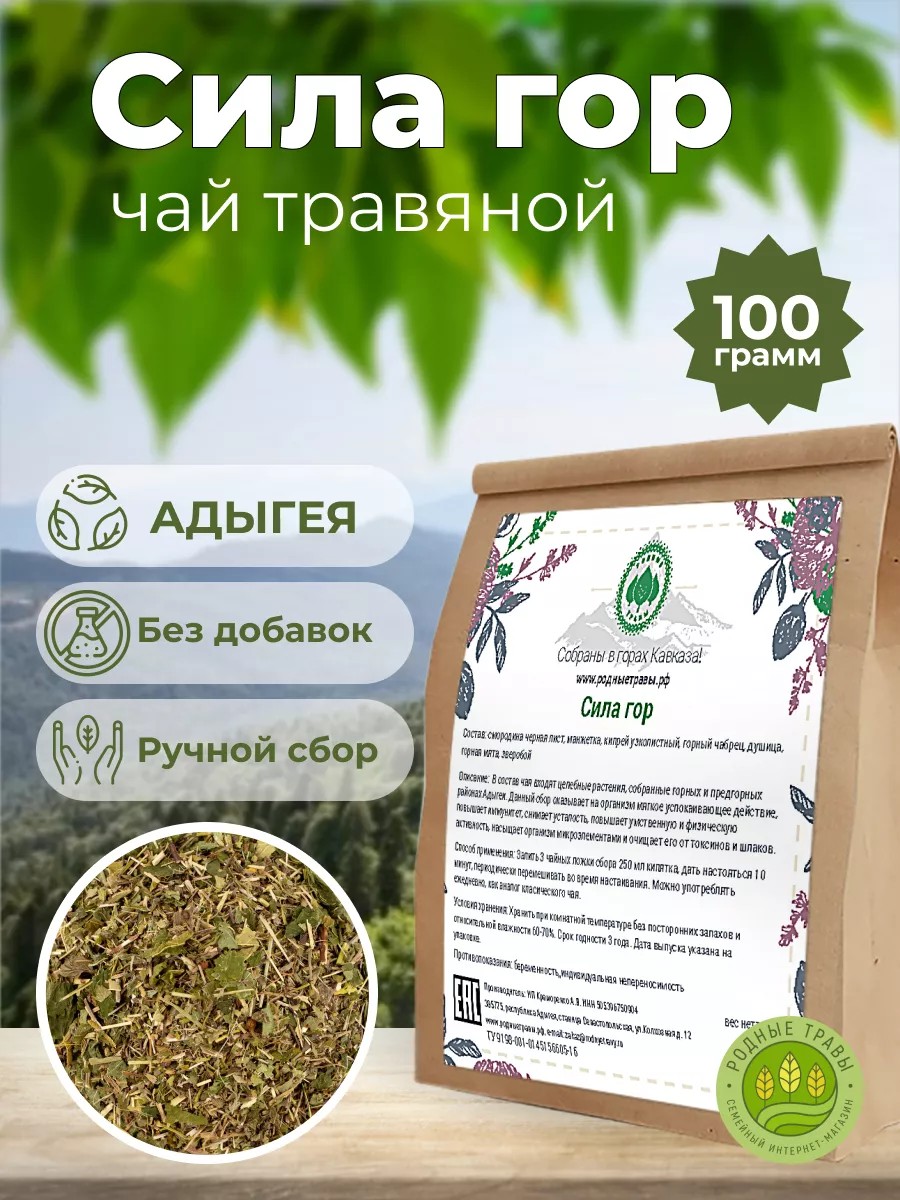 Травяной сбор Сила гор чай рассыпной сушеные лесные травы. Место заготовки: горная Адыгея. Состав: смородина черная лист, манжетка, кипрей узколистный, горный чабрец, душица, горная мята, зверобой. : В состав чая входят целебные растения, собранные горных и предгорных районах Адыгеи. Данный сбор оказывает на организм мягкое успокаивающее действие, повышает иммунитет, снимает усталость, повышает умственную и физическую активность, насыщает организм микроэлементами и очищает его от токсинов и шлаков. Состав сбора имеет оптимальное измельчение для равномерного и качественного заваривания, согласно рекомендациям фитотерапевтов. Лист смородины - заряжает организм витаминами; манжетка - повышает иммунитет, умственную и физическую активность, препятствует процессам преждевременного старения организма, нормализует работу нервной системы, желез внутренней секреции, укрепляет стенки сосудов; кипрей узколистный - повышает иммунитет и насыщает организм микроэлементами; горный чабрец - ускоряет обменные процессы, повышает тонус мышц, снимает стресс и нервное перенапряжение, способствует очищению организма от токсинов и шлаков; душица - успокаевает организм и снимает воспалительные процессы; горная мята - улучшает работу мозга, стимулирует пищеварение, снимает головные боли, облегчает дыхание при заболеваниях органов дыхания, стимулирует сердечную деятельность; зверобой - снимает симптомы депрессии, сонливости, убирает тревогу, поднимает настроение. Масса нетто: 100 грамм. Условия хранения: Хранить при комнатной температуре без посторонних запахов и относительной влажности 60-70%. Срок годности 3 года. Дата выпуска указана на упаковке. Способ применения: залить 3 чайных ложки сбора 250 мл кипятка, дать настояться 10 минут, периодически перемешивать во время настаивания. Можно употреблять ежедневно, как аналог классического чая. Противопоказания: индивидуальная непереносимость, беременность. Комплектация: 1 упаковка. Родные травы - ваш надежный проводник в мире природных целебных трав и кореньев. Мы заготавливаем сушеные травы, листья и побеги, цветки и лепестки, соцветия, сухие корни и корневища, лесные ягоды и плоды, орехи, семена, которые мы тщательно собираем в экологически чистых регионах России. Краснодарский край и Адыгея - это наши основные районы сбора растений. Особое внимание уделяется горному Крыму, Алтаю, Дальнему Востоку, Сибири, Дагестану, регионам Северного Кавказа и другим южным регионам России богатыми лекарственными растениями.Здесь, среди живописных ландшафтов, растут дикие лесные травы и цветы, которые обладают уникальными лечебными свойствами. Мы гордимся тем, что можем предложить вам только самое лучшее из этого богатства.Нашу продукцию применяют для производства такой продукции как, травяные сборы, фиточай, фитосбор, чайных напитков, настоек, порошков для капсул и таблеток, гидролатов, мази, БАД, шампуни, мыло, скарбы и др.