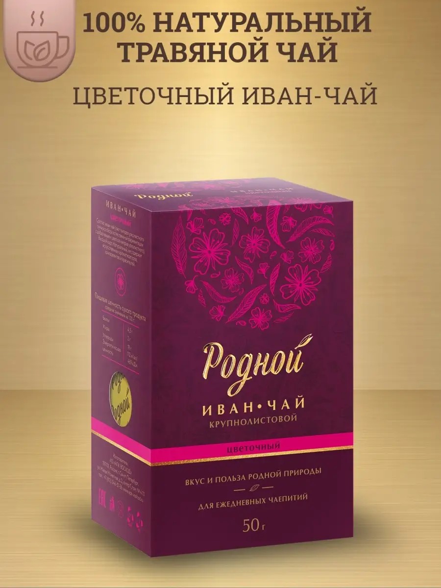 В поисках самого лучшего мы создали эксклюзивный напиток - иван-чай листовой " Цветочный " "Родной". Чайный напиток крупнолистовой содержит цветы кипрея, которые при заваривании красиво раскрываются у вас в чашке. Издавна считалось, что цветы иван-чая наделяют красотой, молодостью и гармонией, имеют успокаивающий эффект и используются для похудения. К тому же травяной чай без кофеина не нагружает нервную систему, что позволяет употреблять его разным группам населения. Для производства нашего чая мы используем рассыпной крупнолистовой иван чай, ферментированный естественным образом, который мы упаковываем в специальную фольгу, защищающую чай от влаги и света. Попробуйте и другие композиции крупнолистового чая " Родной ": " весенний ", " медовый ", " традиционный ". Также всегда в наличии линейка пакетированного иван-чая и подарочный вариант шкатулки с ассорти вкусов.