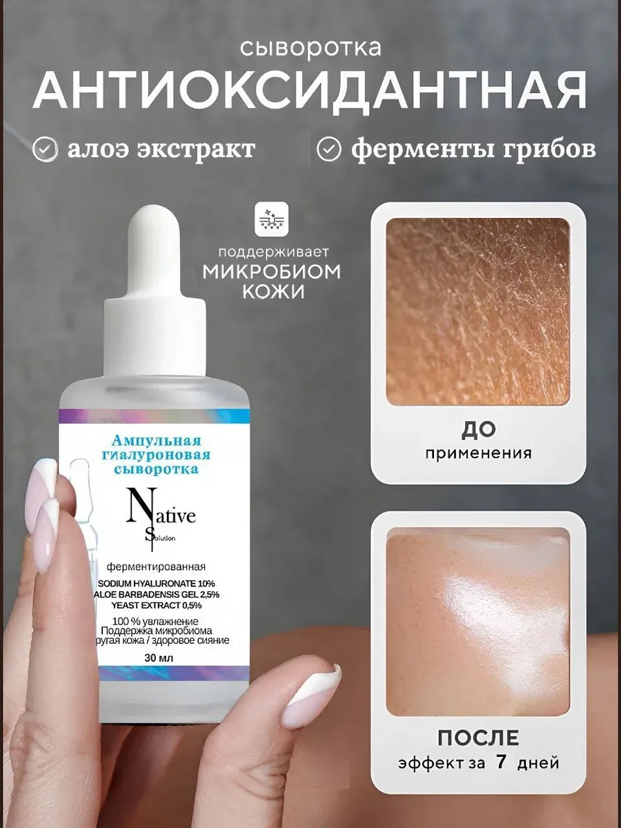 Уникальная формула, обогащенная галуронкой, витаминами, аминокислотами, алоэ, полисахаридами, экстрактом дрожжей и антиоксидантами, интенсивно питает и увлажняет кожу, возвращая ей упругость и сияние. Ферменты гриба и аргинин, разглаживает морщины и выравнивает тон, укрепляет защитный барьер, уменьшает воспаление, сухость и покраснения. Регулярное применение сыворотки с гиалуроном заметно улучшает текстуру кожи, делая ее более гладкой, эластичной и бархатистой. А это означает, что её можно использовать как базу и макияж ляжет безупречно!