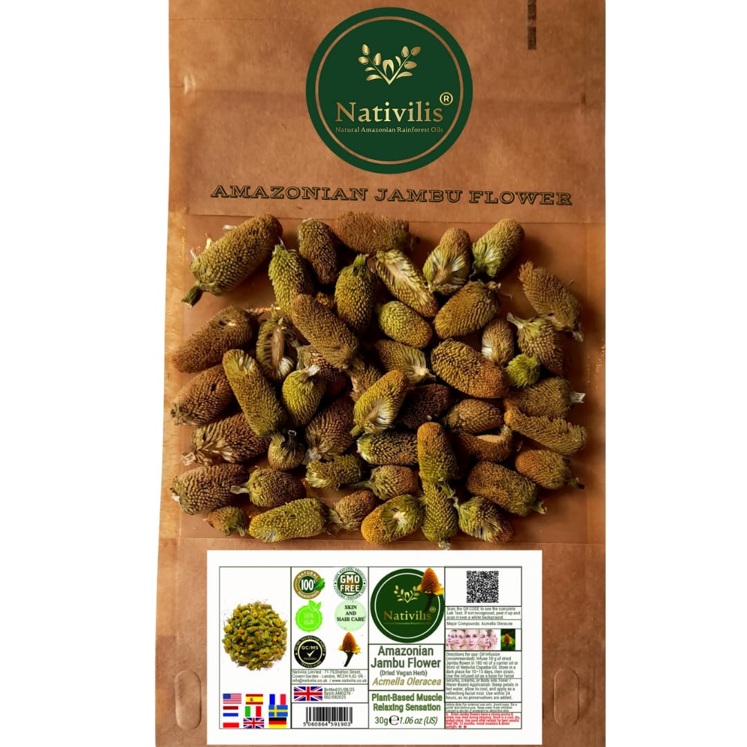 Known as Jambu Flower Acmella oleracea, this ian botanical is valued for its spilanthol content, making it a unique herbal ingredient in natural skincare. ? For external use only perform patch test before first use avoid eyes broken skin keep out of reach of children pets not for ingestion vegan additive-free. Shelf life: 12 months store in a cool, dry, sealed container away from moisture sunlight prepare infusions soon after opening to preserve potency freshness. Versatile cosmetic ingredient for serums, creams, facial oils, toners masks easily infused in carrier oils or Copaiba oil for daily skincare. ? Popularly called "Botanical B-tox", it enhances microcirculation, improves skin tone and helps reduce fine lines perfect for vegan sustainable beauty formulations. 100 pure Dried Jambu Flower (Acmella oleracea) from the , rich in spilanthol – a natural active known for its gentle firming, tightening and revitalising effect.