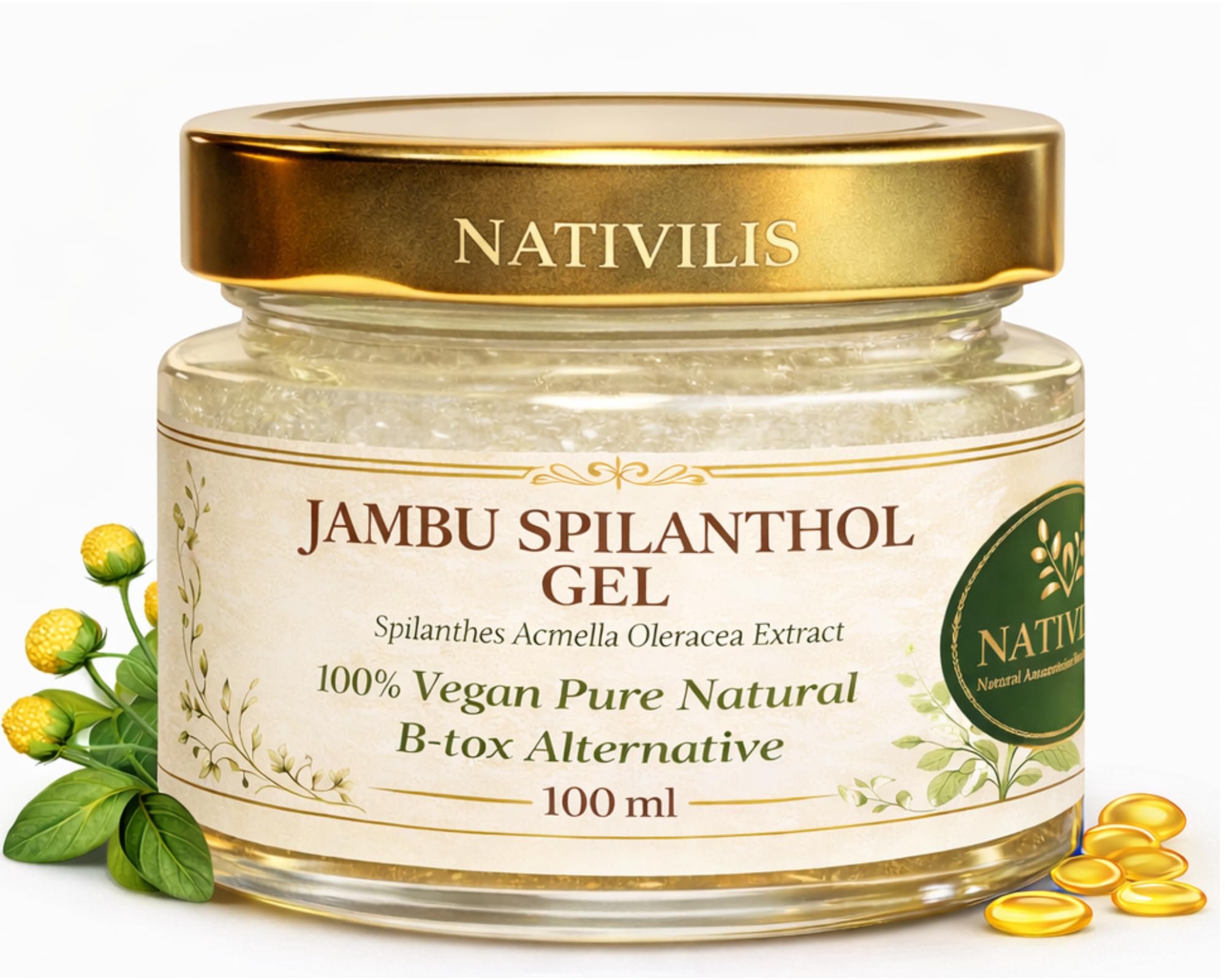 Nativilis Jambu Spilanthol Gel – (extrait de Spilanthes Acmella Oleracea) – Alternative au B-tox naturel 100 végétalien pour améliorer la fermeté de la peau Copaiba – 100 ml