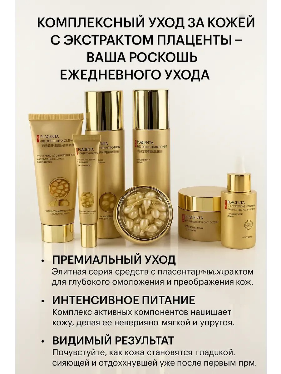Комплексный уход за кожей лица с экстрактом плаценты — это премиальная линейка средств, созданная для тех, кто ценит качество, эффективность и видимый результат. Формула с плацентарным экстрактом глубоко питает и увлажняет кожу, улучшает её текстуру и возвращает естественное сияние.