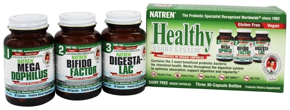 Natren Healthy Start Kit Diary Free Kit contains: 1 Bottle of Mega Dophilus Dairy Free 30 capsules 1 Bottle of Bifido Factor Dairy Free 30 capsules 1 Bottle of Digesta-Lac Dairy Free 30 capsules Working together, this dynamic trio of Natren products provides all the friendly bacteria you need in one simple system. A complete system for digestive problems: Helps maintain normal cholesterol levels. Assists in the absorption of calcium and other vitamins and minerals. Increases nutritional values by producing essential B vitamins. Promotes regularity. Enhances lactose metabolism and digestion of milk products. Produces hydrogen peroxide (H2O2), necessary to inhibit intestinal and vaginal yeast. Neutralizes toxin formation. Potency guaranteed through printed expiration date. Researched, formulated and manufactured only by Natren