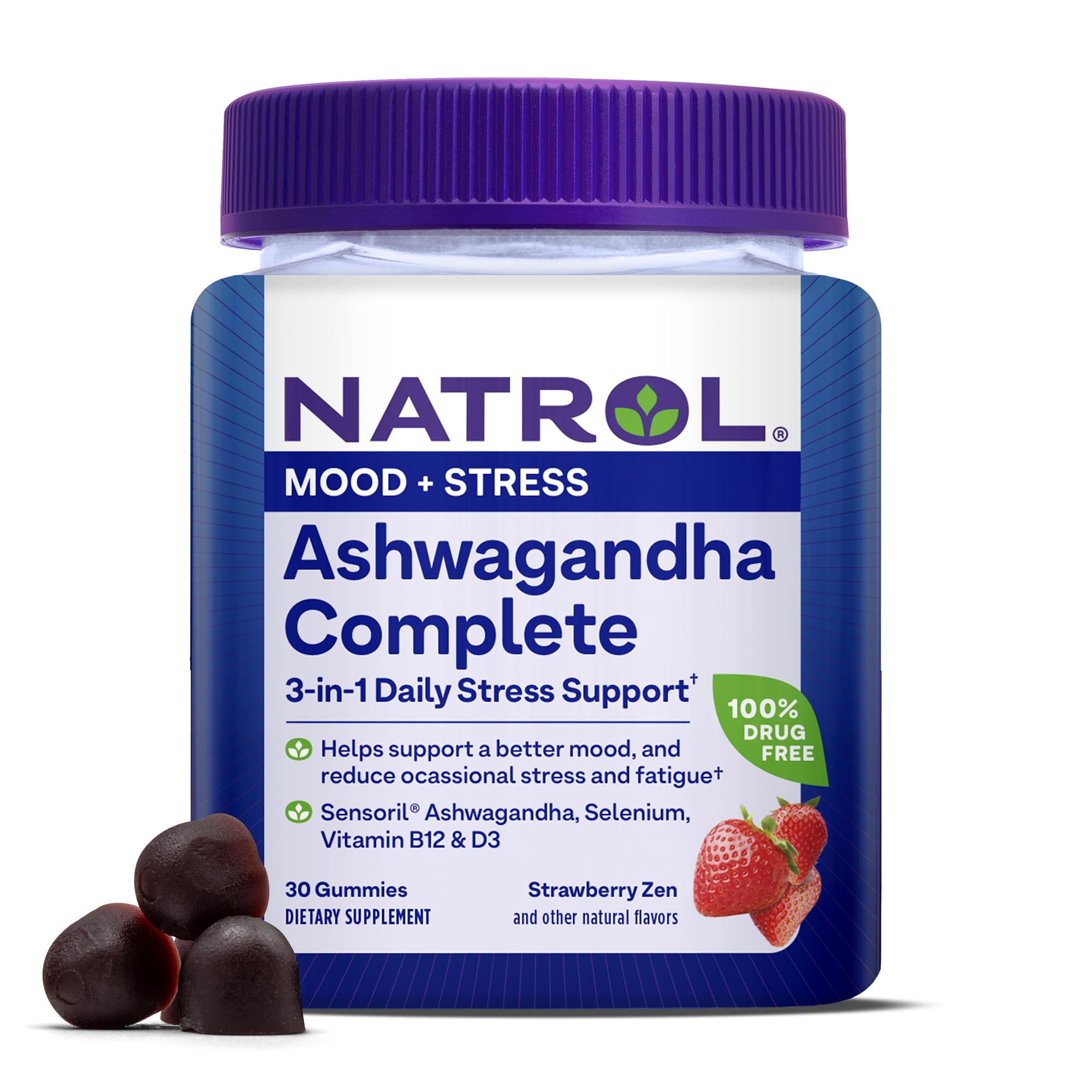 Natrol Ashwagandha Complete Gummy helps provide 3-in-1 daily stress support.(1) This dietary supplement helps reduce occasional stress, fatigue and irritability and also support immune health and cellular energy.(1) Made with Sensoril Ashwagandha, selenium and vitamin B12 and D3. Made without artificial flavors, sweeteners, or synthetic dyes, this supplement is also non-GMO, vegetarian and gelatin-free. This supplement is 100 drug free and contains no milk, egg, fish, crustacean shellfish, tree nuts, peanuts, wheat, soybeans or sesame. Use this ashwagandha gummy for mood and stress and for general health. Suggested Use: Adults, take 2 ashwagandha gummies daily. Chew thoroughly before swallowing. Natrol is dedicated to creating innovative, quality products, to help you maintain good health and thrive in your busy, modern lifestyle. (1)These statements have not been evaluated by the Food and drug administration. This product is not intended to diagnose, treat, cure or prevent any disease. (2)Nielsen, xAOC, 52 weeks ending 10 26 24, Sleep Aid Supplements1 DRUG FREE SLEEP AID BRAND IN AMERICA(2) : As the 1 drug free sleep aid brand, we not only have formulas to help you fall asleep faster, we also offer fast-acting and effective formulas that can help calm your mind and body and maintain good health. 100 DRUG FREE SUPPLEMENT: Made with clean ingredients, 100 drug free and free of common food allergens, this dietary supplement comes a 15 day supply. COMPLETE SUPPORT: Made with selenium and vitamin B12 and D3 to support immune health and cellular energy(1). SUPPORT A BETTER MOOD: This ashwagandha supplement is made with Sensoril Ashwagandha to help reduce occasional stress, fatigue and irritability(1). 3-in-1 FORMULA: Natrol Ashwagandha Complete Gummy helps provide 3-in-1 daily stress support supporting a better mood, reducing occasional stress and fatigue(1).
