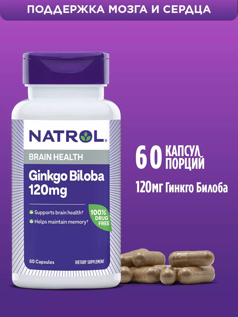 NATROL Гинкго билоба, Ginkgo Biloba, витамины для памяти, 60 кап