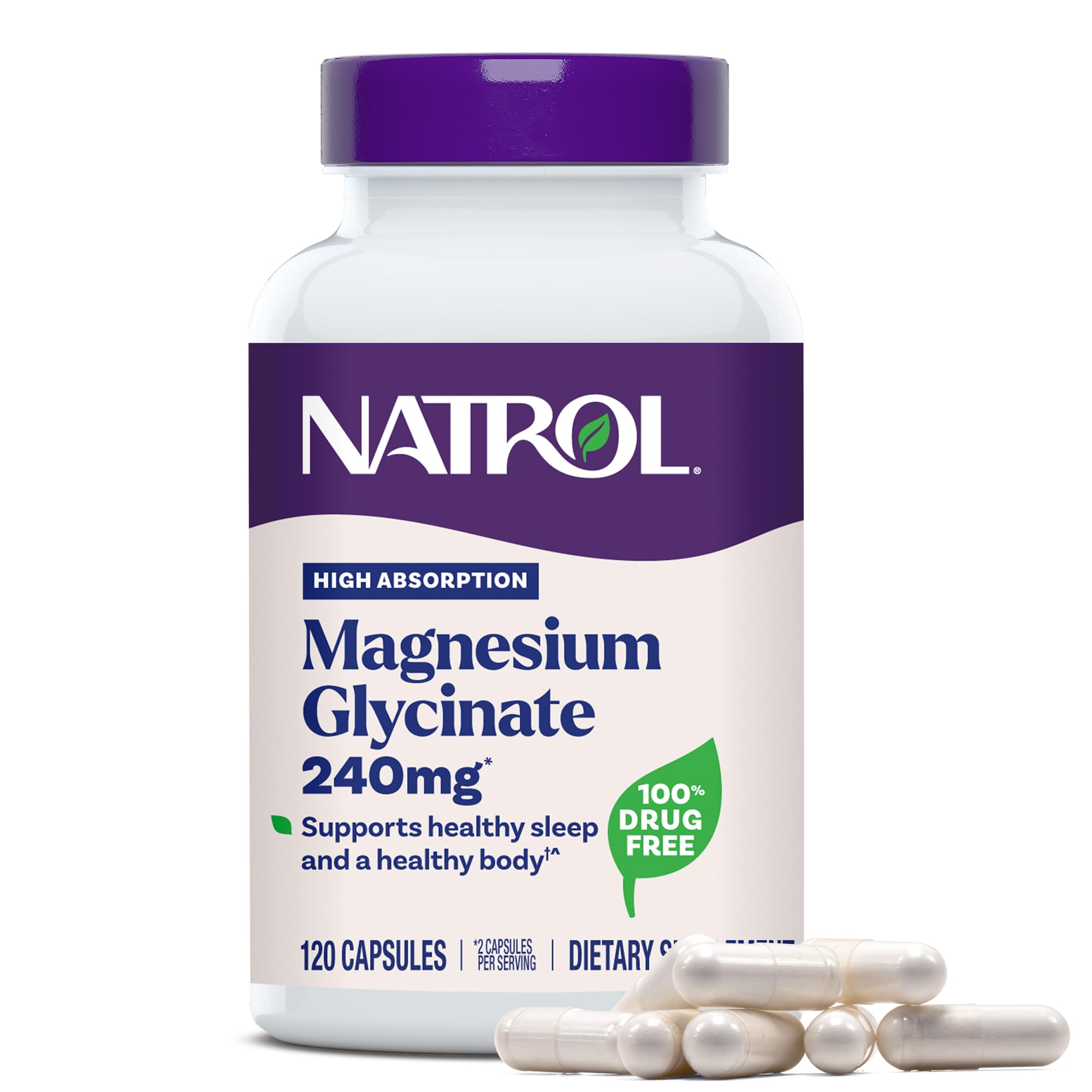 Natrol High Absorption Magnesium Glycinate 240 mg helps support healthy sleep and a healthy body.(1) Magnesium Glycinate is a highly bioavailable form of magnesium that is gentle on the stomach.(1) Magnesium-glycinate supports many functions in the body: healthy sleep, muscle relaxation, heart health, bone health, nerve health and brain health(1). These magnesium glycinate capsules contains no milk, egg, fish, crustacean shellfish, tree nuts, peanuts, wheat, soybeans or sesame. Use this magnesium supplement for sleep and general health.(1) Suggested Use: Adults, take two magnesium caps once a day with a meal. For those exploring alternatives, consider our magnesium glycinate powder for sleep or enjoy the convenience of magnesium glycinate gummy formulations. Elevate your health and wellness with Natrol Magnesium Glycinate, a great addition to your modern lifestyle. (1)These statements have not been evaluated by the Food and drug administration. This product is not intended to diagnose, treat, cure or prevent any disease. (2)Nielsen, xAOC, 52 weeks ending 4 28 25, Sleep Aid Supplements1 DRUG FREE SLEEP AID BRAND IN AMERICA(2): As the 1 drug free sleep aid brand, we not only have formulas to help you fall asleep faster, we also offer fast-acting and effective formulas that can help calm your mind and body and maintain good health. GENTLE ON THE STOMACH: Gentle on the stomach and free of major allergens, this dietary supplement comes in a 60 day supply of magnesium capsules to support your general health and wellness(1). SUPPORTS MANY FUNCTIONS IN THE BODY: Magnesium Glycinate is a highly bioavailable form of magnesium, which supports healthy sleep, muscle relaxation, heart health, bone health, nerve health, brain health and metabolic function(1). MUSCLE RELAXATION SUPPORT: Formulated with magnesium glycinate 240 mg for adults supports muscle relaxation (1). MAGNESIUM FOR SLEEP: Natrol high absorption magnesium glycinate capsules for adults, help support healthy sleep and healthy body helping you maintain a restful routine with calm sleep.