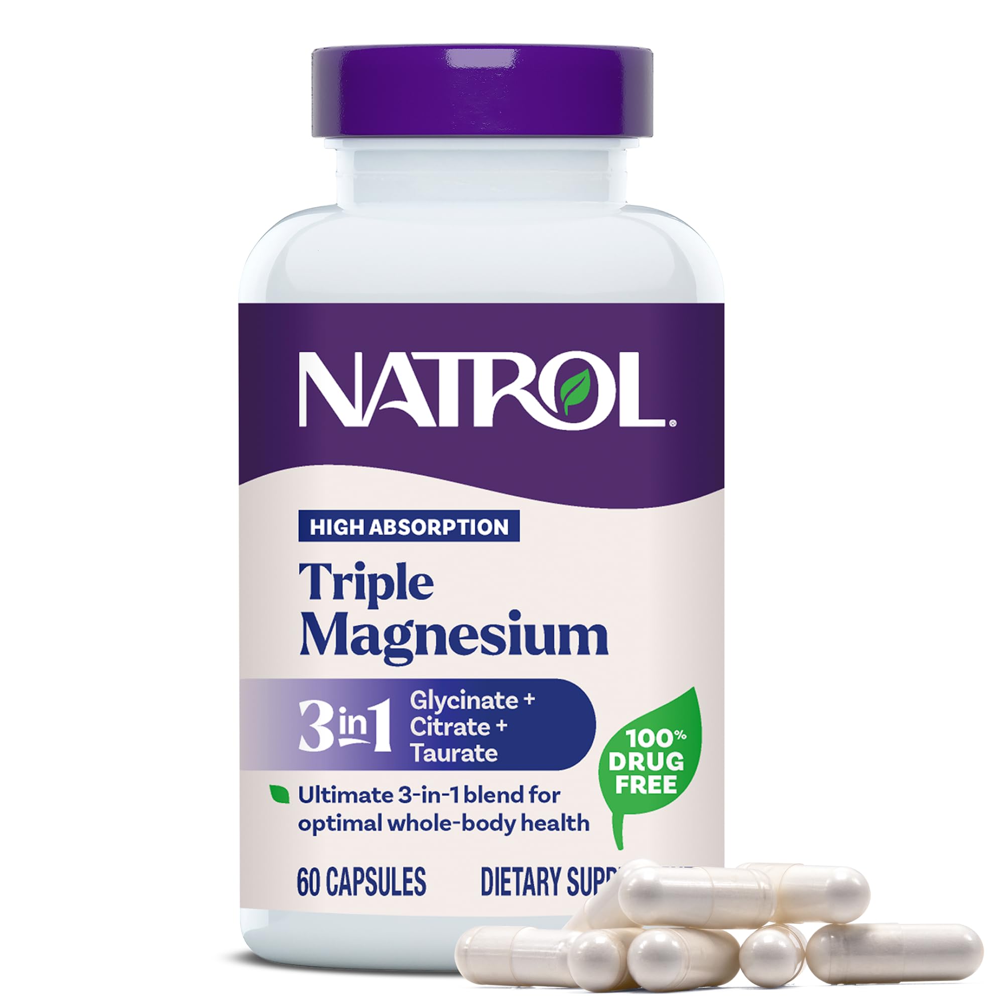 This magnesium complex supplement is the foundation for mind and body well being with Natrol Triple Magnesium Complex — a blend of three highly absorbable forms of magnesium: Glycinate, Citrate, and Taurate.(1) Each serving delivers a blend of 200 mg of elemental magnesium to help promote whole-body wellness. (1) Magnesium plays a critical role in over 300 biochemical reactions in the body. This carefully formulated complex supports muscle function, nerve health, and cardiovascular health. (1) A convenient and effective supplement for busy professionals, students, and wellness enthusiasts to keep in their supplement cabinet. Adults, take two capsules by oral ingestion once a day with or without a meal and water. This magnesium complex for women or men fits seamlessly into a daily routine. Natrol is dedicated to creating innovative, quality products, to help you maintain good health and thrive in your busy, modern lifestyle. (1)These statements have not been evaluated by the Food and drug administration. This product is not intended to diagnose, treat, cure or prevent any disease. (2)Nielsen, xAOC, 52 weeks ending 12 27 25, Sleep Aid Supplements.1 DRUG FREE SLEEP AID BRAND IN AMERICA(2): As the 1 drug free sleep aid brand, we not only have formulas to help you fall asleep faster, we also offer fast-acting and effective formulas that can help calm your mind and body and maintain good health. Gentle on the stomach and free of major allergens, this dietary supplement comes in a 30 day supply of triple magnesium complex capsules to support your general health and wellness. Supports Muscle, Nerve Heart Health: Essential for energy production, cardiovascular health, and maintaining muscle and nerve function with triple magnesium complex (1). Foundation for Mind and Body Well-Being: This multi magnesium supplement supports muscle health, nerve health, and brain health (1). Magnesium triple complex supplement for high absorption: delivers magnesium glycinate, magnesium citrate, and magnesium taurate in a 200mg blend to support muscle health, nerve health, and overall wellness (1).