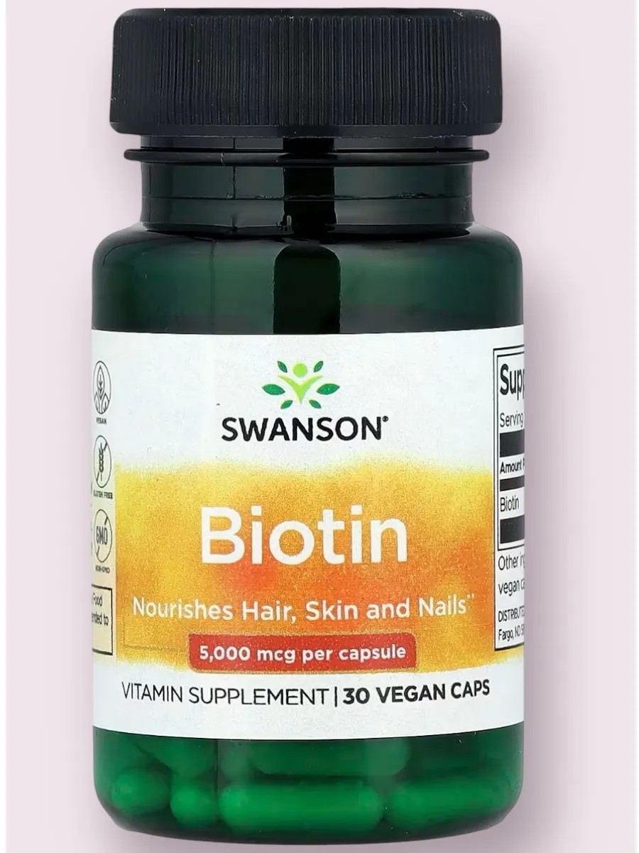 Swanson Biotin 5,000 mcg, 30 capsules. Swanson Biotin - Often called the "beauty nutrient" due to the nutrition it provides for healthy hair and scalp, this component of the B-vitamin complex is a key cofactor for enzymes involved in fatty acid metabolism, helping to supply cells with energy. Swanson Premium Biotin supplies 5,000 mcg (5 mg) of D-biotin, a naturally occurring, biologically active form.