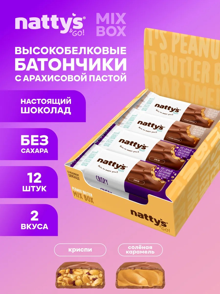 Nattys Mixbox — это ассорти вкусных и натуральных протеиновых батончиков без сахара, с начинкой и покрытием из настоящего молочного шоколада. Идеальный батончик протеиновый без сахара для тех, кто хочет совместить здоровье, вкус и пользу.