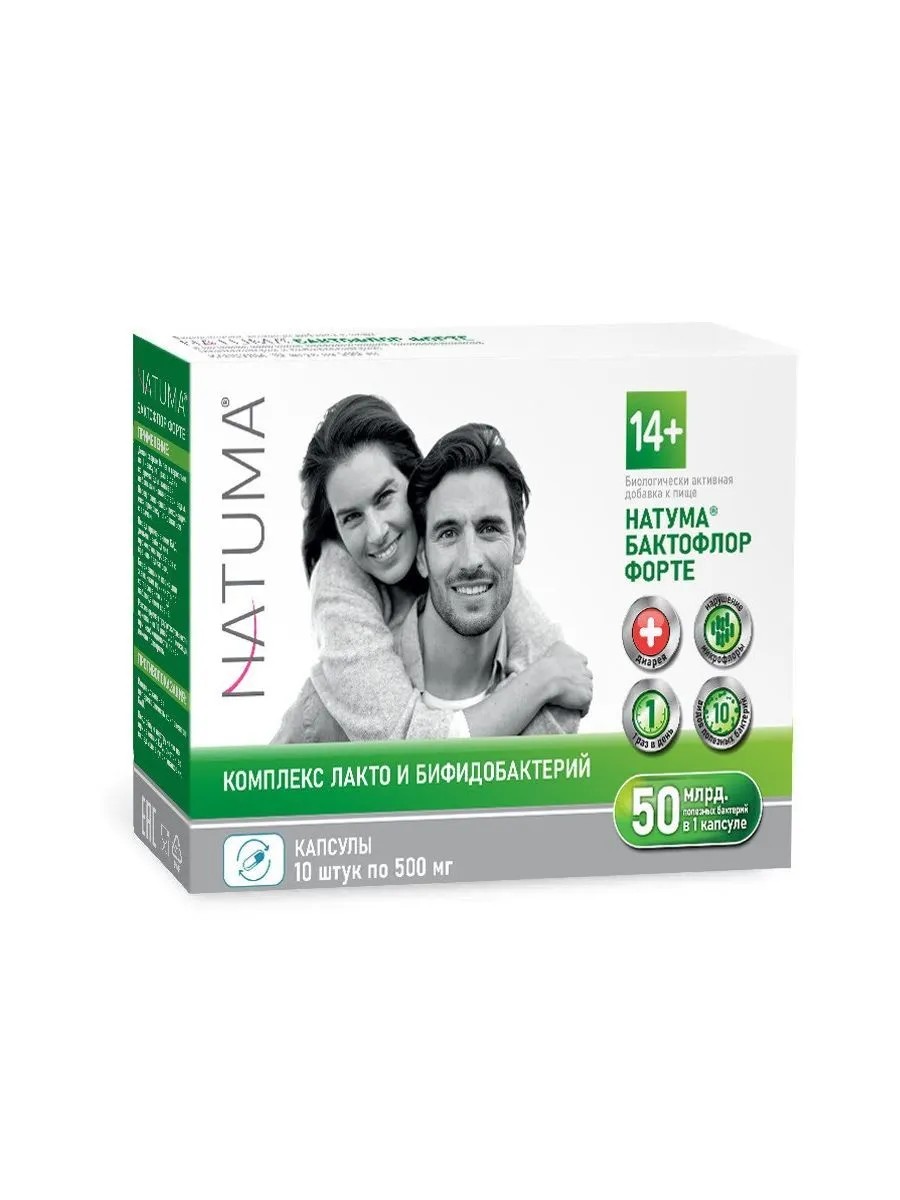 natuma бактофлор форте n10 капс по 500мг. дополнительный источник лакто- и бифидобактерий. в качестве биологически активной добавки к пище. комплекс лакто- и бифидобактерий, мальтодекстрин, оболочка капсулы. для реализации населению в качестве биологически активной добавки к пище - источника пробиотических микроорганизмов (лактобактерий и бифидобактерий). (далее согласно приложению). биологически активные вещеcтва в капсуле: лактобактерии, кое/капсула, не более (на конец срока годности) - 5х10*9, бифидобактерии, кое/капсула, не более (на конец срока годности) - 4,5х10*10 -