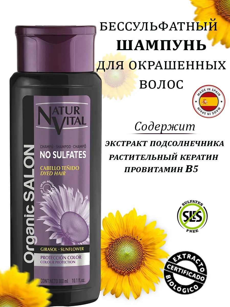 Если вы ищете идеальное средство для ухода за окрашенными волосами, обратите внимание на бессульфатный шампунь, произведенный в Испании. Этот уникальный продукт специально разработан для защиты и сохранения яркости цвета ваших волос. Благодаря органическому экстракту подсолнечника, полученному из сертифицированного земледелия, ваши локоны получат надежную защиту от негативного влияния окружающей среды.Шампунь от Natur Vital обеспечивает бережное очищение, не содержащий сульфатов, силиконов и солей, он подходит даже для волос, прошедших кератиновое выпрямление. Нежная дермо-растительная формула заменяет агрессивные сульфаты на мягкие поверхностно-активные вещества, полученные из кокоса, что делает его идеальным выбором для ежедневного использования.Благодаря растительному кератину и провитамину B5, этот шампунь глубоко увлажняет и питает волосы, придавая им мягкость и блеск. УФ-фильтр, входящий в состав, защищает цвет от солнечного излучения, позволяя вам дольше наслаждаться насыщенными оттенками. Вы забудете о тусклых волосах — с бессульфатным шампунем от NaturVital ваши локоны будут выглядеть живыми и здоровыми.Кроме того, экстракт семян подсолнечника не только защищает цвет, но и обладает противовоспалительными и антисептическими свойствами, что делает его отличным выбором для чувствительной кожи головы. Эфирное масло подсолнечника дополнительно заботится о здоровье ваших волос, укрепляя их и придавая им сияние.Не упустите возможность подарить своим волосам качественный уход, который они заслуживают. Выбирая бессульфатный шампунь для окрашенных волос, вы делаете шаг к их здоровью и красоте. Откройте для себя новый уровень ухода за волосами и наслаждайтесь ярким цветом и блестящими локонами каждый день с Натур Витал!