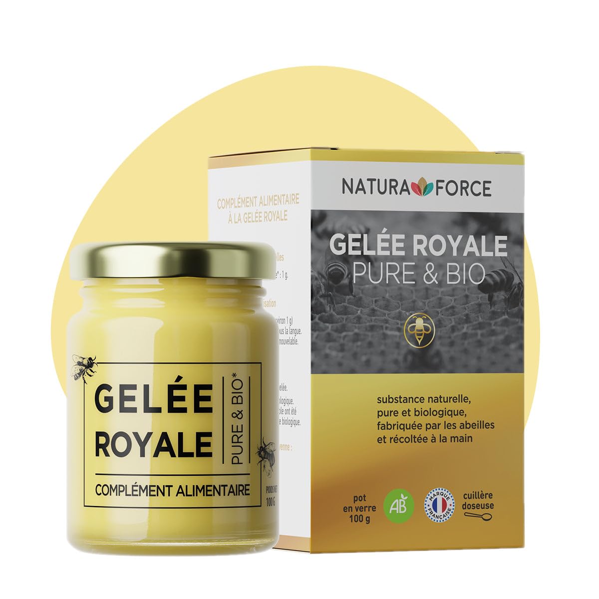 NATURA FORCE : notre mission est de vous offrir les aliments les plus naturels et bénéfiques qui soient et de vous aider à vivre de façon plus saine et en meilleure santé. Nos produits proviennent directement d'agriculteurs du monde entier, soigneusement sélectionnés pour leur savoir-faire et la qualité de leur production. PRODUITS NATURELS BIO : Natura Force est une marque française de compléments alimentaires naturels et sains, conçus et fabriqués en France pour améliorer votre santé et rester en forme. RECOMMANDATIONS D'EMPLOI : la gelée royale peut être consommée de manière ponctuelle, en cure, durant les changements de saison ou bien tout au long de l'année, de façon continue, afin d'améliorer naturellement son immunité. Riche en vitamines, en oligo-élements et en divers nutriments, il s'agit d'un complément alimentaire naturel de premier plan. COMPOSITION : 100 PURE GELÉE ROYALE d'origine biologique. Le pot en verre aide à une meilleure conservation au réfrégirateur. BOOSTEZ VOTRE IMMUNITÉ : issue de la ruche, la gelée royale aide à réduire la fatigue physique et intellectuelle, à renforcer les défenses immunitaires et à améliorer le fonctionnement général de l'organisme.