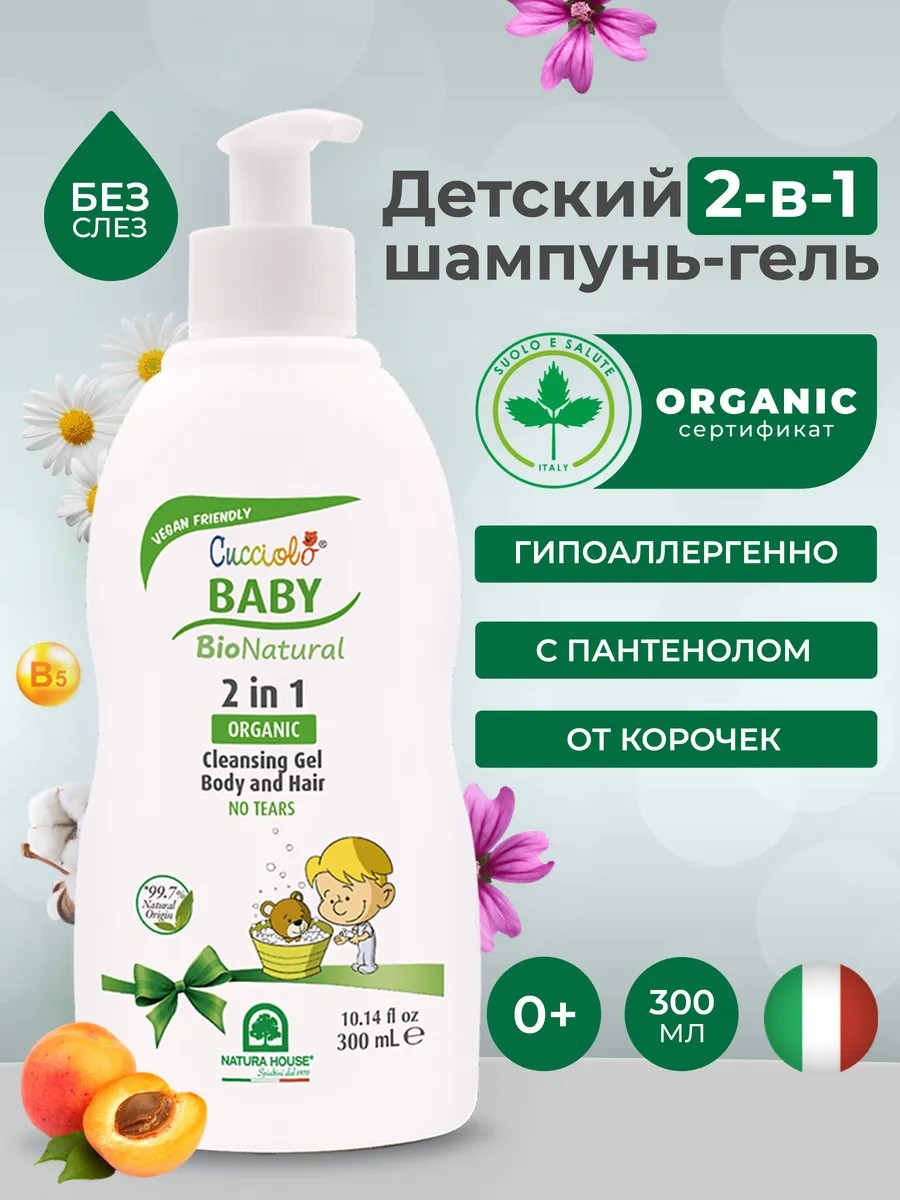 Cucciolo Baby Bio Natural от итальянского бренда Natura House – это деликатное очищающее органическое средство 2 в 1 для волос, тела и лица, разработанное специально для детей и новорожденных. Благодаря сертифицированным активным ингредиентам оно успокаивает и напитывает влагой кожу ребенка, хорошо промывает и распутывает непослушные волосы, избавляет от себорейных (молочных) корочек. Содержит ПАВ исключительно растительного происхождения, которые обеспечивают бережное очищение. Гипоаллергенный шампунь, подходит даже для самой чувствительной кожи. Дерматологически протестирован. Формула без слез: не вызывает раздражения и не щиплет глаза. Нежная текстура. Приятный аромат. Легко пенится и смывается. В составе 99,7% натуральных активных ингредиентов. Экстракт хлопка: увлажняет, восстанавливает, придает коже эластичность, защищает. Абрикосовое масло - мощный антиоксидант, богатый витаминами А и Е: питает, смягчает и восстанавливает кожу. Ромашковая вода: снимает покраснения, успокаивает, смягчает кожу и оказывает противоотечное действие. Экстракт мальвы: обладает увлажняющими, смягчающими и противовоспалительными свойствами. Пантенол (провитамин В5): сохраняет кожу мягкой и эластичной.