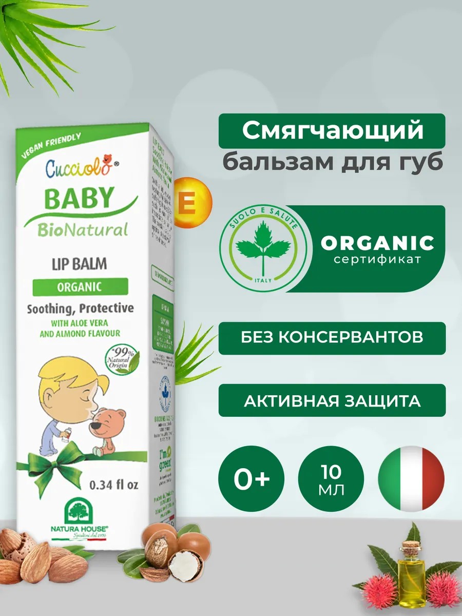 Прозрачный органический бальзам Cucciolo Baby Bio Natural от Natura House станет незаменимым помощником для ухода за нежной кожей губ ваших малышей с самого рождения. Безводная основа смягчает и питает губы, создает на них стойкую защитную пленку без ощущения липкости. Детская губная помада обладает увлажняющими, питательными, смягчающими, защитными, водоотталкивающими, регенерирующими и успокаивающими свойствами. Благодаря своей уникальной формуле, этот бальзам обеспечивает надежную защиту и интенсивное восстановление губ, предотвращая их сухость и трещины, защищает от обветривания, придает глянцевый блеск. Детский органический бальзам разработан специально для ежедневного ухода, предназначен для использования как дома, так и во время прогулок. Такая гигиеническая губная помада отлично подойдет для детей, подростков и их родителей. Без консервантов, благодаря своей маслянистой основе микробиологически безопасен, содержит антиоксиданты. В составе 99% натуральных активных ингредиентов: алое вера, бисаболол, масло ши, кунжута и миндаля, витамин Е. Гигиенический бальзам изготовлен на основе гипоаллергенного карнаубского воска. Подходит даже для самой чувствительной кожи новорожденных. Дерматологически протестирован. Приятная текстура, быстро впитывается, оставляя на губах приятные ощущения. Приятный аромат карамели. Без цвета. Выпускается в удобной упаковке, которая поместится в любую сумочку или карман, что делает его идеальным компаньоном для игр на улице и прогулок. Родители высоко оценят блеск для губ, созданный именно для детей, ведь они могут быть спокойны за безопасность средства, даже если ребенок его проглотит. Cucciolo Baby Bio Natural - веганская био косметика, произведенная без использования компонентов животного происхождения, которая не тестируется на животных. Продукция не содержит вредных веществ: парабенов, силикона, минеральных масел, красителей, аллергенов, сульфатов. Разработано и произведено в Италии при сотрудничестве с дерматологами и педиатрами.