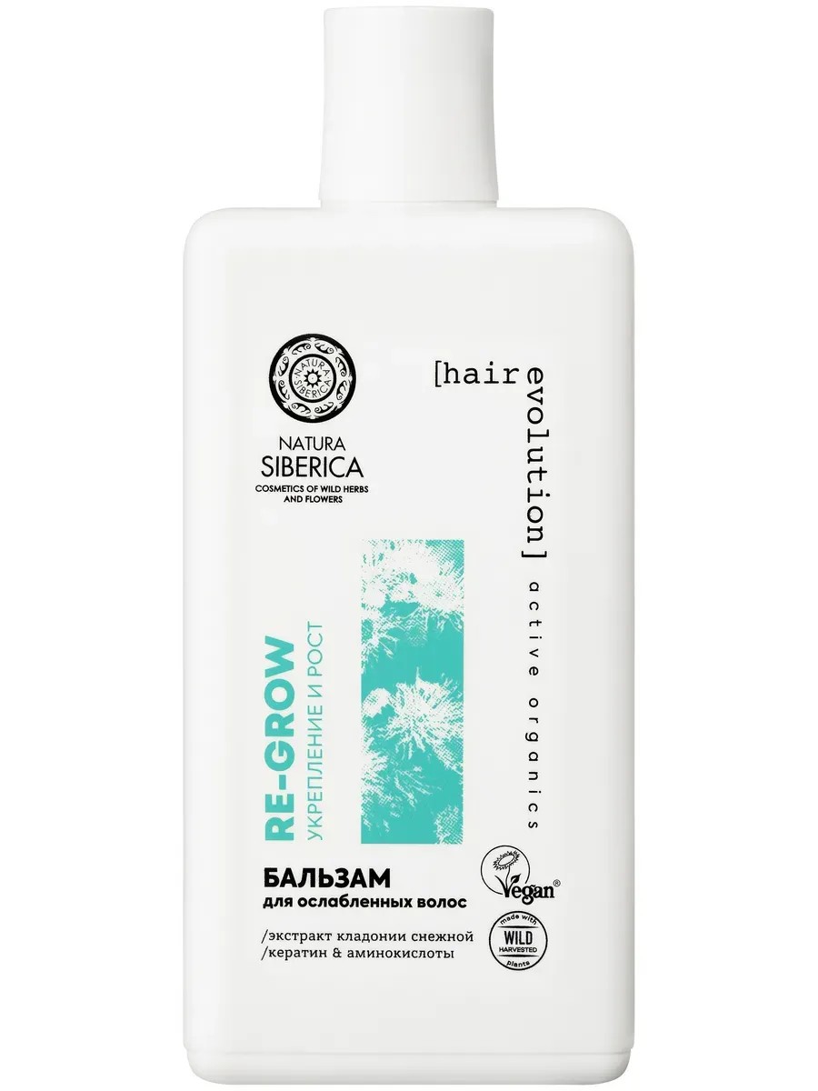 Бальзам Natura Siberica Hair Evolution Re-Grow для ослабленных волос, укрепление и рост, экстракт кладонии снежной, кератин и аминокислоты, 270 мл. Бальзам RE-GROW. Укрепление и рост волос увлажняет и укрепляет волосы по всей длине, предотвращая повреждения и ломкость. Придаёт естественный блеск и здоровый вид волосам. Состав:Aqua with infusions of Flavocetraria Nivalis ExtractWH, Iris Sibirica Root ExtractWH, Panax Ginseng Root Extract*, Rhodiola Rosea Root ExtractWH, Rhododendron Adamsii Leaf/Stem Extract*, Dasiphora Fruticosa Extract*; Cetearyl Alcohol, Cetrimonium Chloride, Guar Hydroxypropyltrimonium Chloride, Lauryl Glucoside, Hydrolyzed Keratin, Sodium PCA, Sodium Lactate, Arginine, Aspartic Acid, PCA, Glycine, Alanine, Serine, Valine, Proline, Threonine, Isoleucine, Histidine, Phenylalanine, Benzyl Alcohol, Benzoic Acid, Sorbic Acid, Citric Acid, Parfum. * Органический ингредиент. WH Органический экстракт дикорастущего растения Сибири. нанесите на влажные чистые волосы, на 1-2 минуты, смойте тёплой водой.