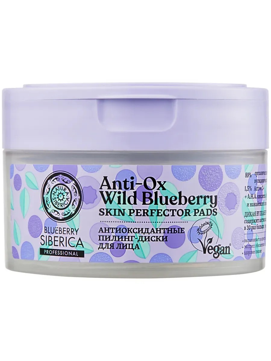 Natura Siberica Blueberry Antioxidant Facial Peeling Pads, 20 pcs. Skin Perfector Pads block free radicals, stimulate metabolism, prolonging youthfulness, and even out skin tone, leaving skin smooth and radiant. Active C+ vitamin C is suitable for sensitive skin. It protects against UV radiation, brightening and reducing pigmentation, and stimulates collagen synthesis. AHA acids from lingonberry and Nanai magnolia vine normalize sebaceous gland function, provide excellent exfoliation, and help reduce hyperpigmentation, improving complexion. Ingredients: Aqua with infusions of Vaccinium Vulcanorum Fruit Extract WH (volcanic blueberry hydrolate), Vaccinium Vitis-Idaea Fruit Extract* (lingonberry extract), Schisandra Chinensis Extract WH (Nanai magnolia vine extract), Ribes Nigrum Leaf Extract* (black currant leaf extract), Vaccinium Myrtillus Fruit Extract* (bilberry extract), Sambucus Nigra Flower Extract WH (black elderberry flower extract), Bidens Tripartita Flower/Leaf/Stem Water WHH (inala celandine hydrolate), Glycerin, Sodium Ascorbyl Phosphate (vitamin C), Lactic Acid (lactic acid), Glycolic Acid (glycolic acid), Coco-Glucoside, Glyceryl Oleate, Cocoyl Proline, Sodium Hydroxide, Benzyl Alcohol, Sodium Benzoate, Potassium Sorbate, Perfume, Linalool. Wipe the pad over your cleansed face, avoiding the eye area. Turn the pad over and wipe your face again.