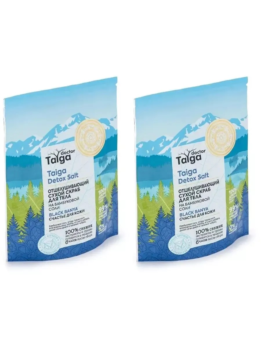 Natura Siberica, Doctor Taiga Dry Body Scrub "Exfoliating. Happiness for Skin," includes two 250 ml scrubs. A super concentrate of taiga plants combined with bamboo salt effectively exfoliates and renews skin cells, providing a powerful detoxifying effect. It protects against free radicals. It stimulates metabolic processes in skin cells, leaving skin smooth and firm. Bamboo salt helps reduce puffiness and creates a slimmer, more toned silhouette. It effectively exfoliates skin cells, provides a powerful detoxifying effect, and activates protective functions. Tuvan juniper and ginger root draw out excess moisture and stimulate metabolic processes in skin cells, creating a slimmer and more toned silhouette. Wild sagan-daylya has high antioxidant activity due to its high vitamin C content. Taiga thyme is a natural antiseptic that soothes and protects the skin from negative environmental factors.