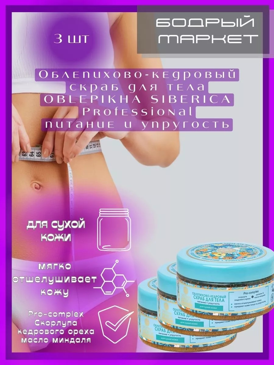 Комплект 3шт. Cкраб для тела Natura Siberica Облепихово-Кедровый Питание + Упругость 300мл Мягко очищает и отшелушивает кожу, придавая ей необычайную мягкость, тонус и упругость. Богатый состав скраба способствует интенсивному питанию и увлажнению кожи. Органическое масло алтайской облепихи - источник жирных кислот Омега 3,6,9 и редкой Омега 7, насыщает кожу полезными макро- и микроэле- ментами. Масло миндаля, чрезвычайно богатое витаминами, обладает питатель- ными и увлажняющими свойствами. Скорлупа кедрового ореха мягко отшелушивает кожу, придавай ей свежий вид. Витамин А устраняет потерю влаги, наполняет кожу энергией и жизненной силой
